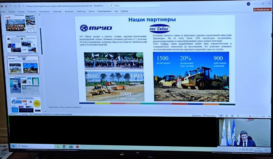 Константин Олегович рассказал об особенностях кластера "Сибирский центр подготовки кадров для транспортной отрасли", о взаимодействии с предприятиями Иркутской области по программе реализации ФП Профессионалитет, особенностях организации учебной и производственной практики студентов колледжа, участии студенческих отрядов колледжа во Всероссийских трудовых проектах "БАМ 2.0" и "Ковыкта-45" в рамках третьего трудового семестра.