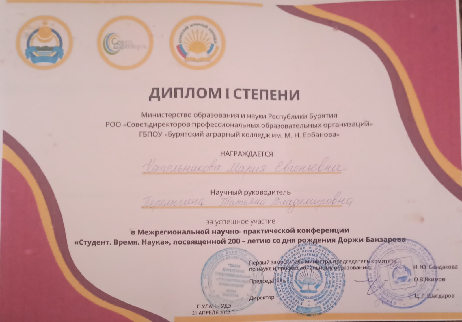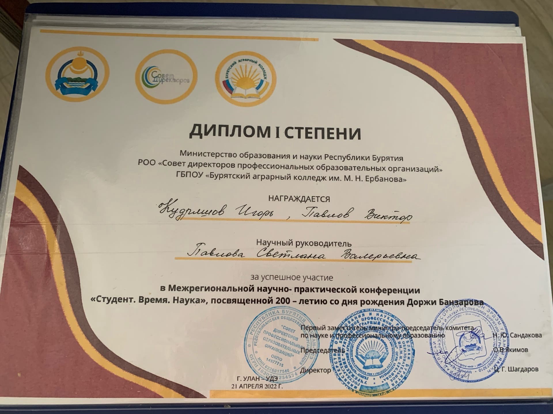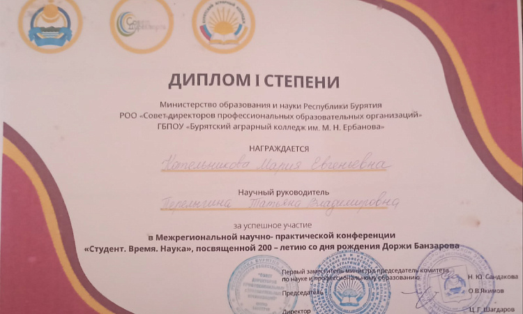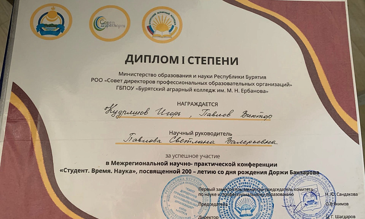 Поздравляем с победой в Межрегиональной научно-практической конференции «Студент.Время. Наука» (БАК РБ), где были представлены результаты исследовательской работы студентов профессиональных образовательных организаций Дальневосточного федерального округа и Иркутской области,