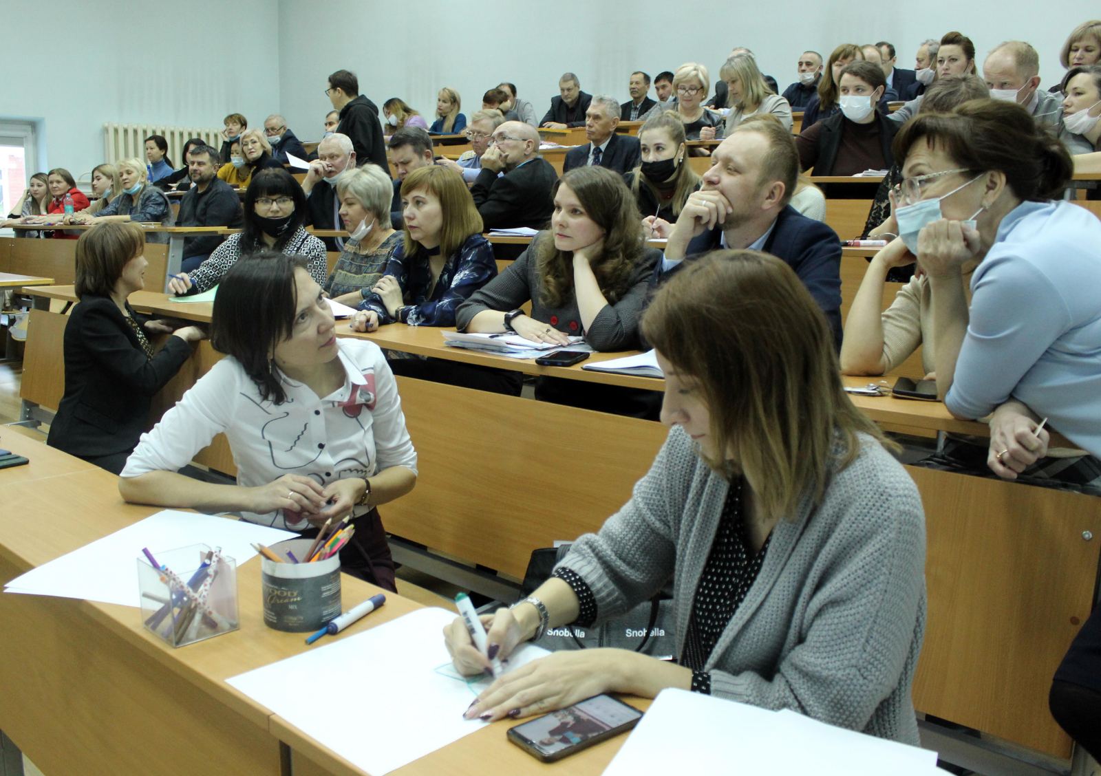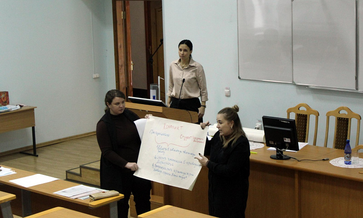 В рамках мероприятия участники семинара выполняли несколько практических заданий, составляли наглядный и словесный портреты педагога советского времени, современного педагога и педагога будущего, в группах разрабатывали стратегию поведения педагога при разрешении определенной конфликтной ситуации, исходя их заданной типологии студентов. Во время теста «Яблоко и червяк» каждый выяснил для себя, какой способ выхода из конфликтной ситуации предпочитает. Семинар прошел продуктивно, педагоги получили теоретические знания и проработали полученные знания на практике.