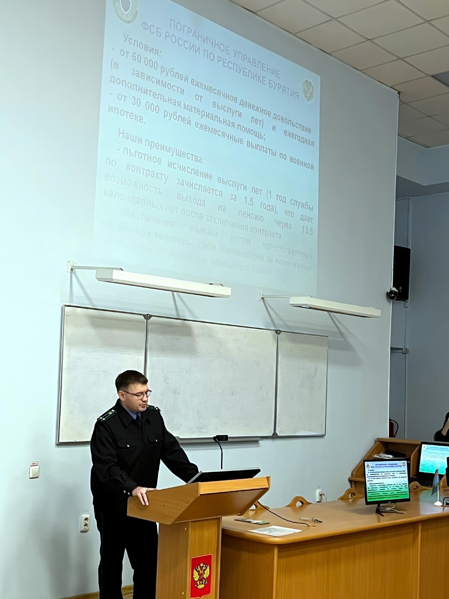 Перед студентами УУКЖТ ИрГУПС выступил представитель пограничного управления ФСБ России по республике Бурятия, рассказав о службе в рядах пограничных войск, получении высшего военного образования.