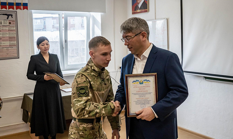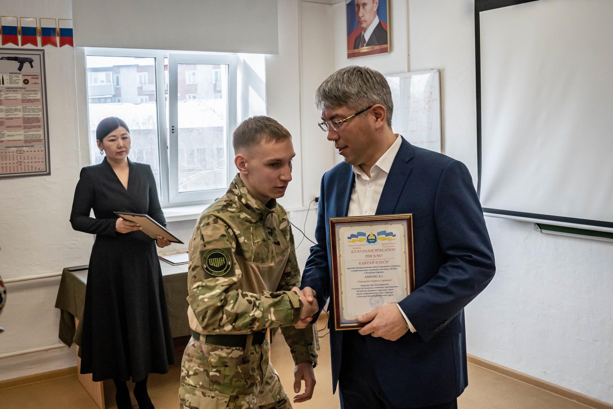 Кроме того, Алексей Цыденов наградил благодарственными письмами курсантов филиала Кирилла Бабенко, Арьяну Дагбацыренову, Артура Пономарёва, Егора Дегтярёва, Арину Блохину, Евгения Чимитова - за успехи в военной игре «Зарница» и на чемпионате России по лазертагу.