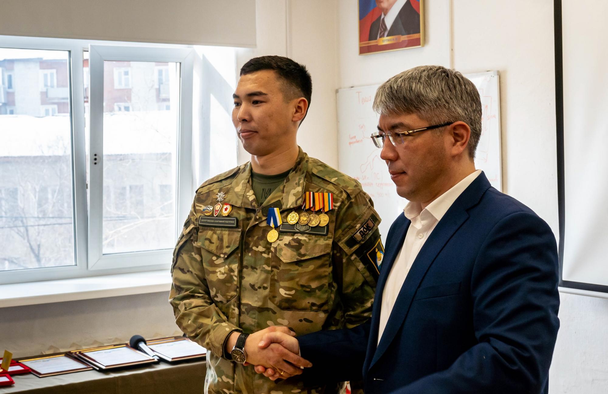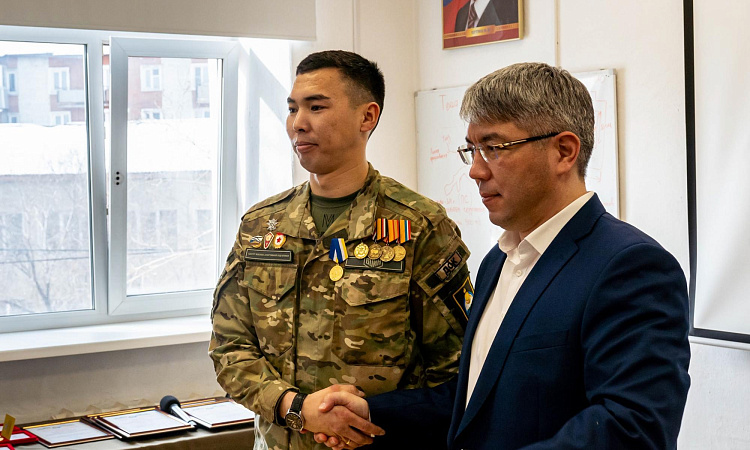 В рамках визита Главы состоялась церемония награждений. Пятеро инструкторов и помощников инструкторов филиала Центра «ВОИН» получили из рук главы республики памятную медаль «За участие в специальной военной операции. Благодарная Бурятия»: Дмитрий Карпов, Юрий Сушкеев, Сайнсак Дугаров, Юрий Терегулов и Сергей Фомин. Также Глава республики вручил директору филиала Николаю Собенникову благодарственное письмо за успехи организации в деле патриотического воспитания.