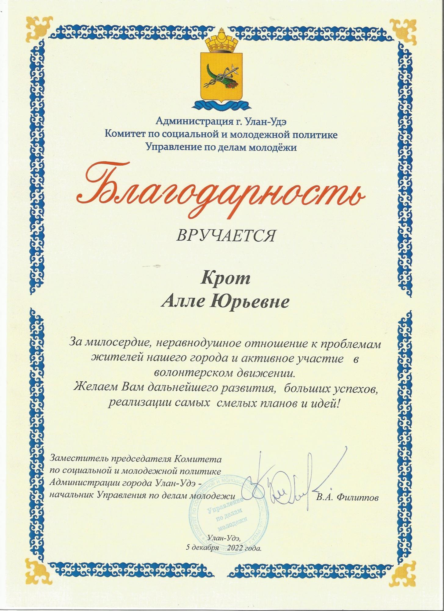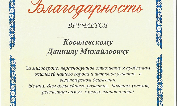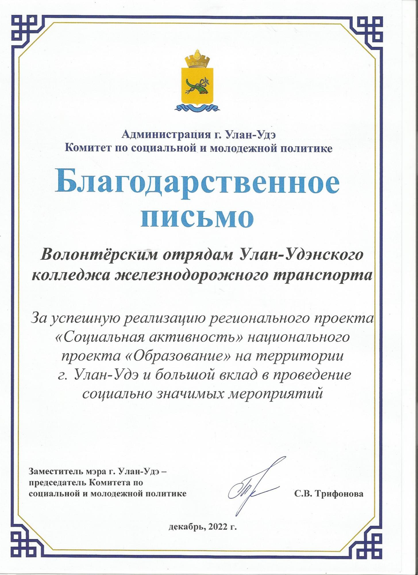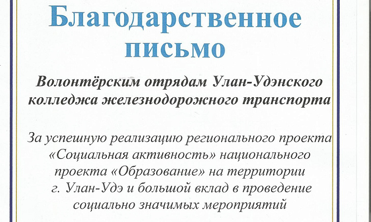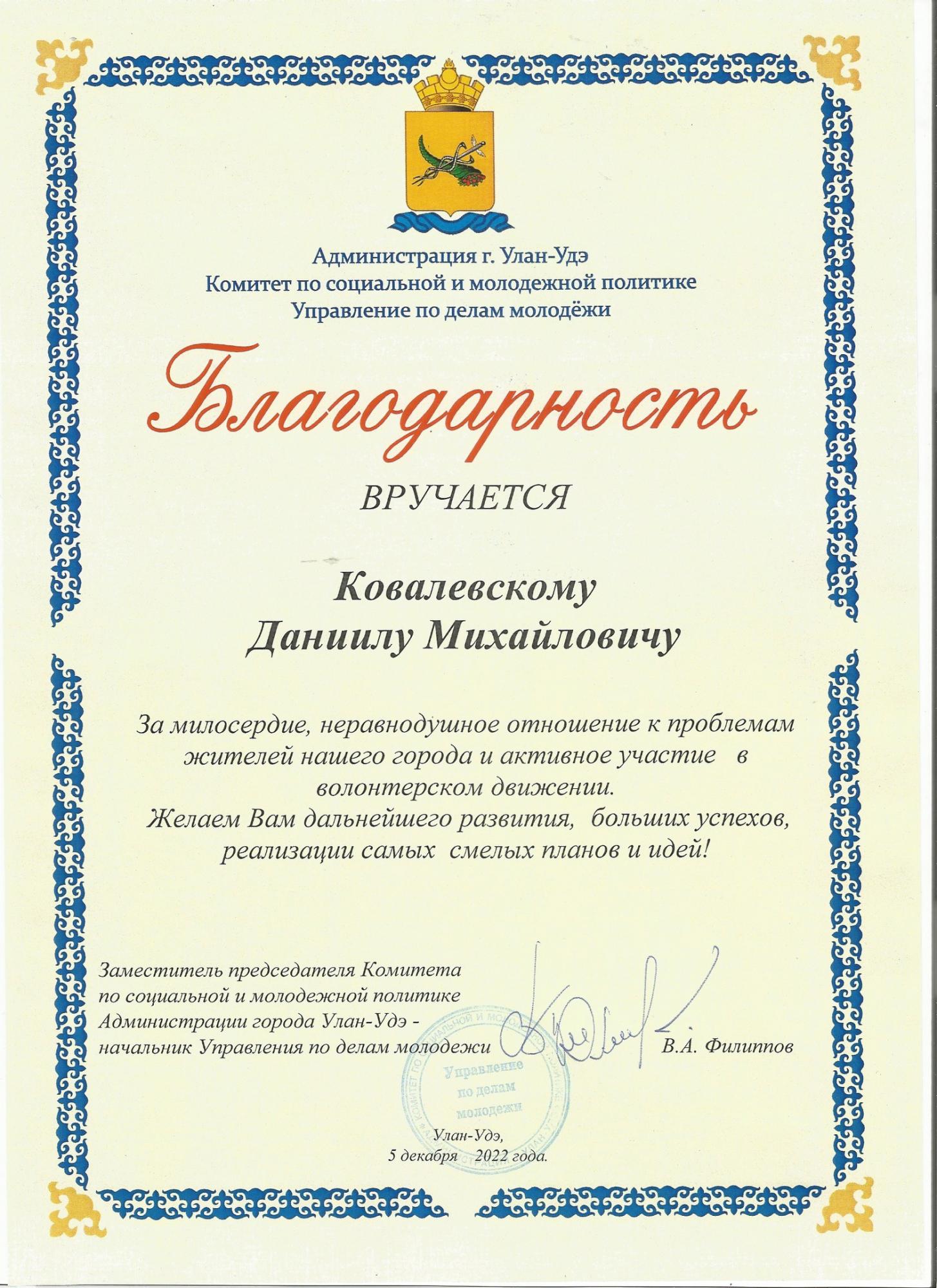 Благодарностью Управления по делам молодежи Администрации города Улан-Удэ за волонтерскую деятельность были отмечены студенты нашего колледжа Ковалевский Даниил и Крот Алла.