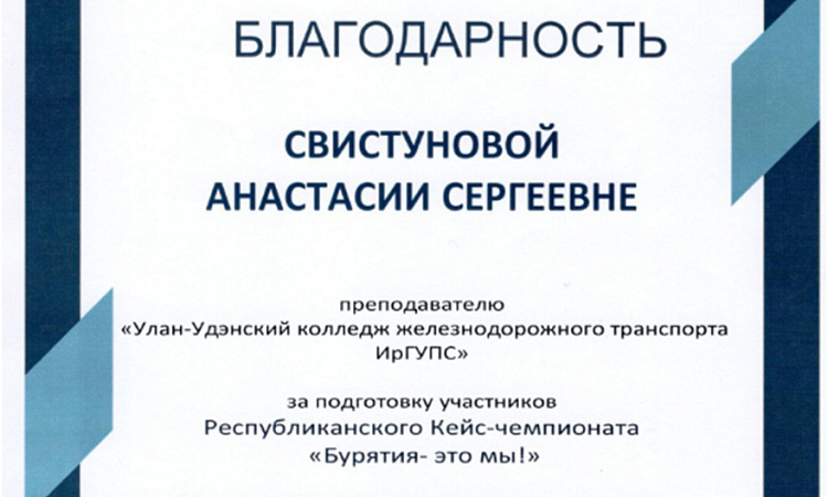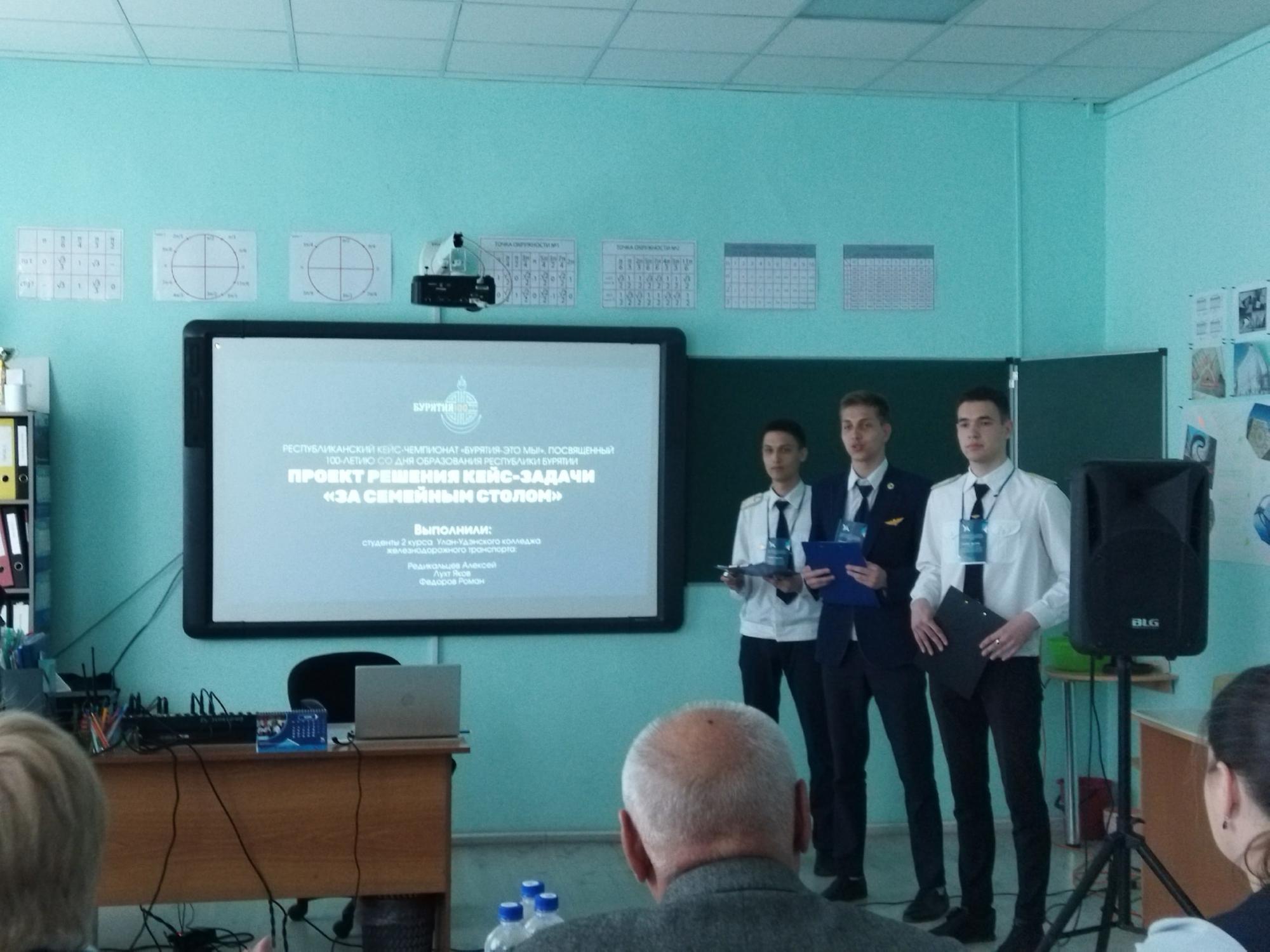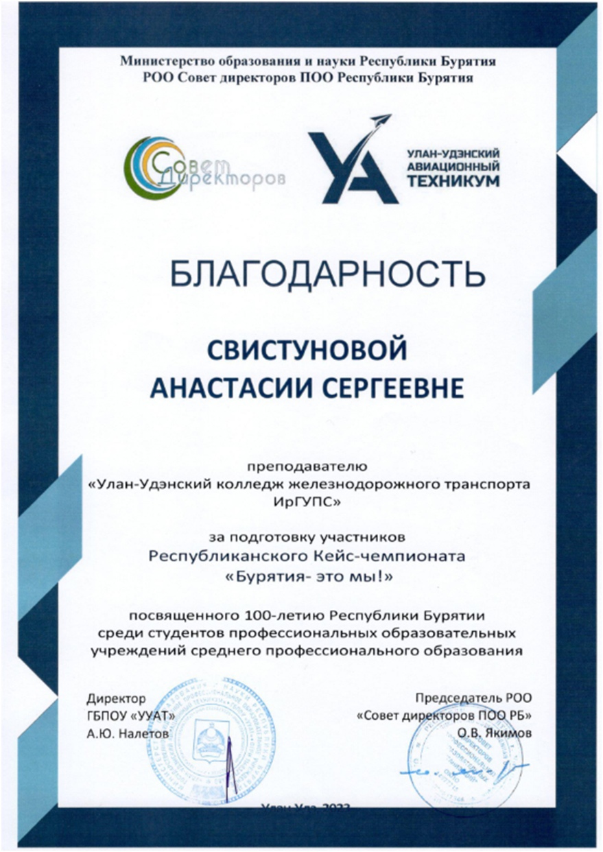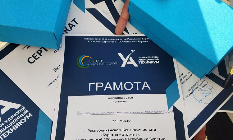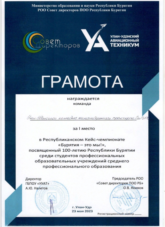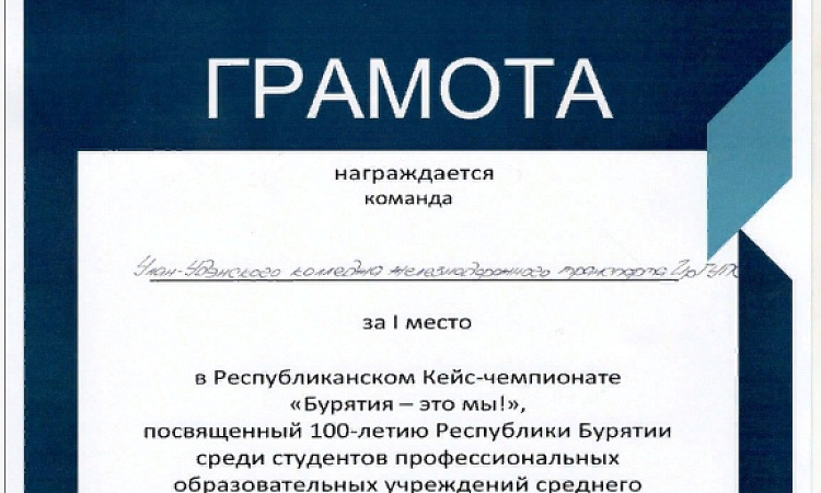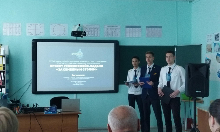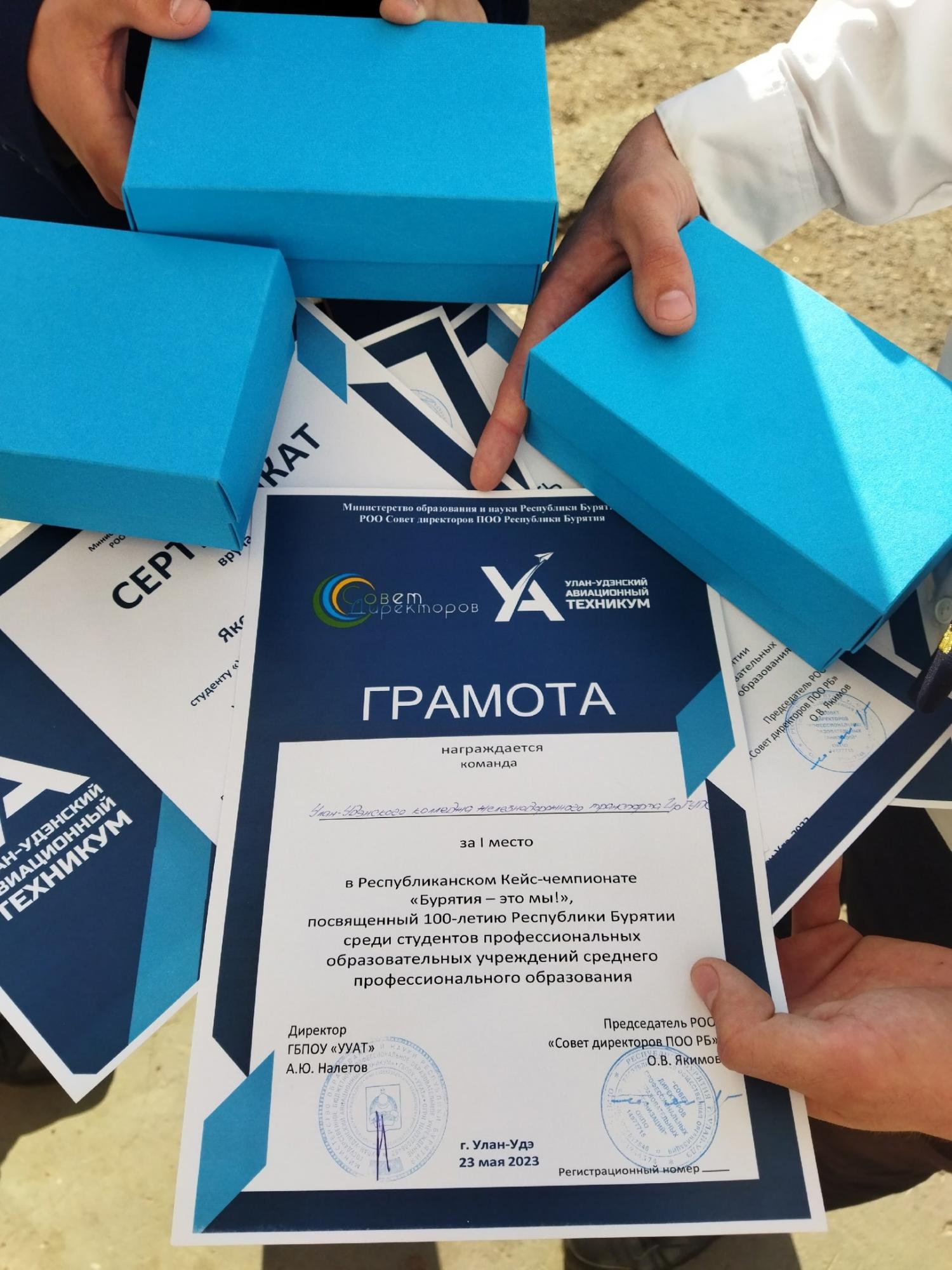 23.05.2023г. в ГБПОУ «Улан-Удэнский авиационный техникум» при поддержке Министерства образования и науки Республики Бурятия, РОО «Совет директоров ПОО Республики Бурятия» прошел Республиканский кейс-чемпионат «Бурятия – это мы!», посвященный 100-летию Республики Бурятия. Команда Улан-Удэнского колледжа железнодорожного транспорта в составе руководителя проекта Свистуновой Анастасии Сергеевны и студентов группы Д.9-21-2 Редикальцева Алексея, Федорова Романа, Лухт Якова заняла 1 место.