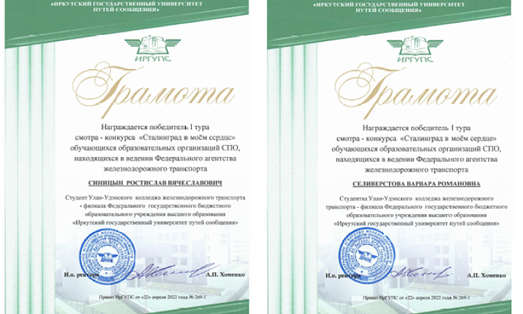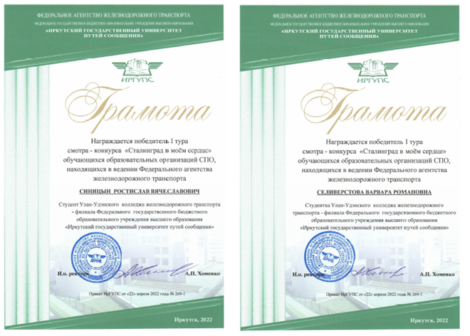Поздравляем победителей второго этапа I тура смотра - конкурса Федерального агентства железнодорожного транспорта "Сталинград в моем сердце" студентов УУКЖТ: Дмитриеву Арину, Селиверстову Варвару, Козырева Владимира, Синицына Ростислава и их научных руководителей Свиридову Наталью Борисовну и Линейцеву Ирину Михайловну! Желаем победы в финале!