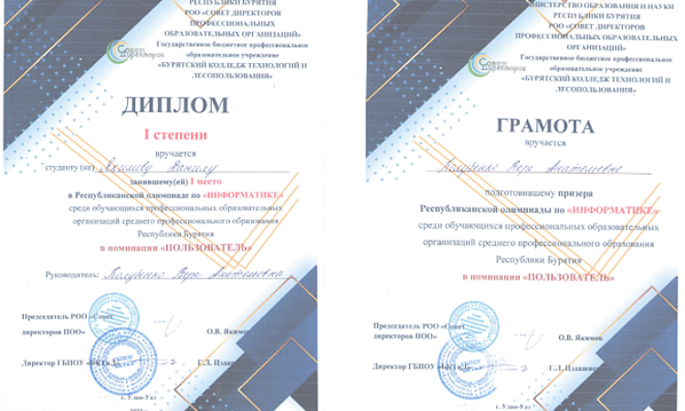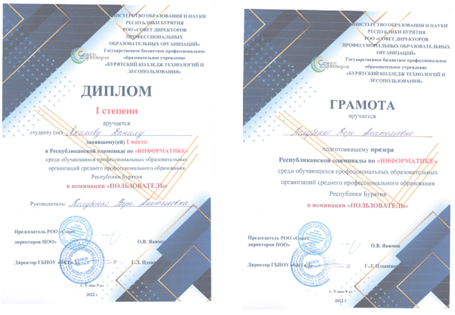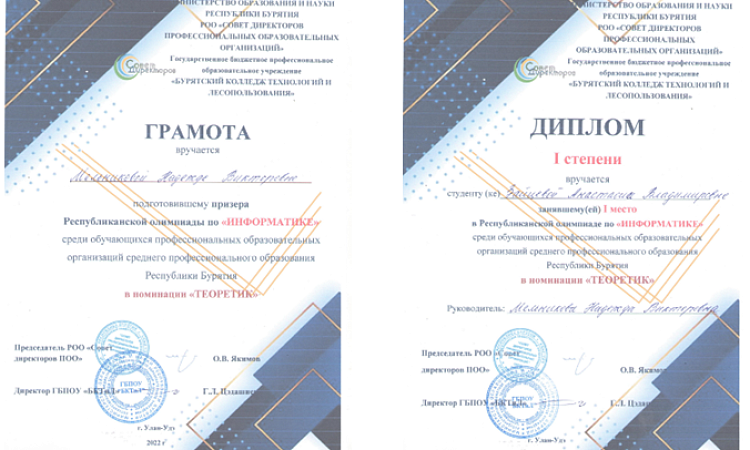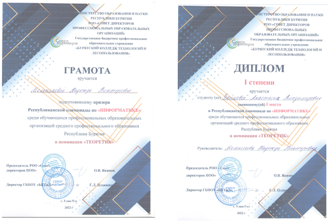 Поздравляем команду студентов УУКЖТ в лице Якимова Данила и Зайцевой Анастасии и их руководителей Полубенко Веру Анатольевну и Мельникову Надежду Викторовну с ЗОЛОТОЙ победой в Республиканской олимпиаде по информатике среди 19 команд профессиональных образовательных организаций Республики Бурятия – 1 место в личном и командном первенстве!