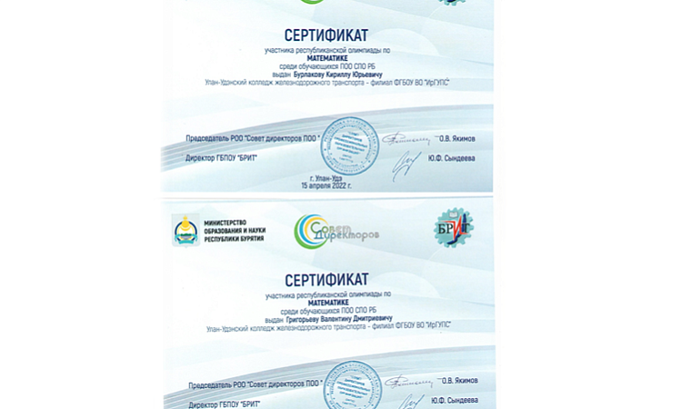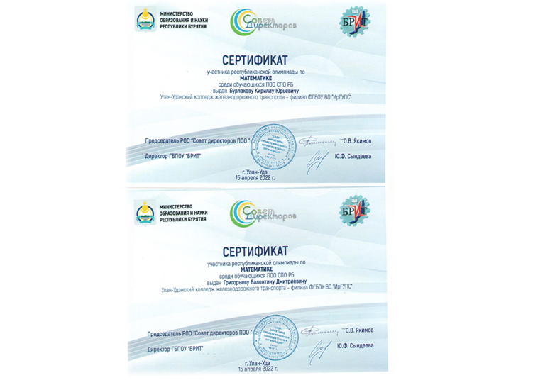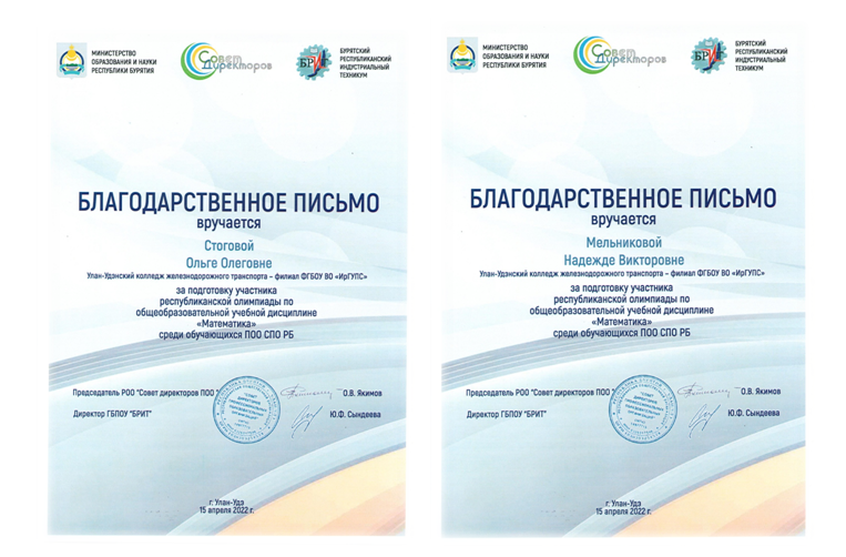 Поздравляем команду студентов УУКЖТ и их руководителей – Стогову Ольгу Олеговну, Мельникову Надежду Викторовну с I местом в республиканской олимпиаде по МАТЕМАТИКЕ среди обучающихся профессиональных образовательных организаций среднего профессионального образования Республики Бурятия! За I место в личном первенстве награжден дипломом победителя студент специальности 23.02.06 Техническая эксплуатация подвижного состава железных дорог (локомотивы) Бурлаков Кирилл!