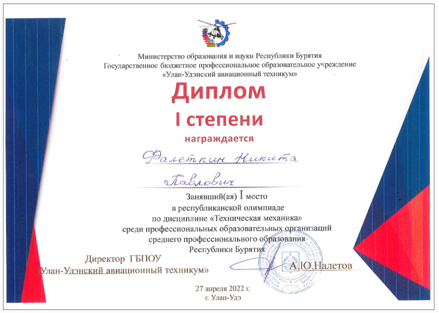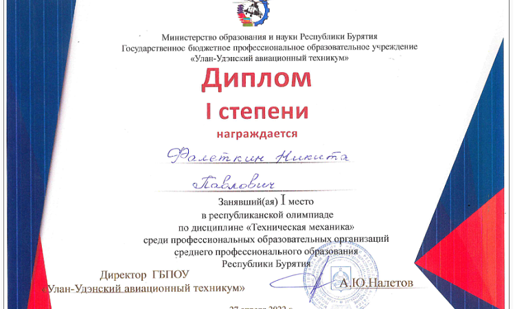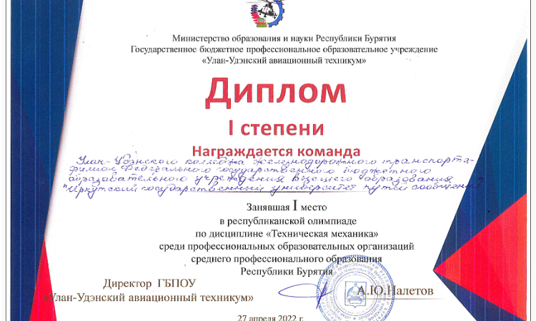 Поздравляем с ЗОЛОТОЙ победой в республиканской олимпиаде по дисциплине «Техническая механика» среди профессиональных образовательных организаций среднего профессионального образования Республики Бурятия команду УУКЖТ в составе студентов специальности 23.02.06 Техническая эксплуатация подвижного состава железных дорог (локомотивы) Фалеткина Никиты (1 место в личном первенстве) и Гурьева Руслана и их руководителя Бочаровой Ирины Александровны!