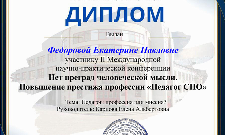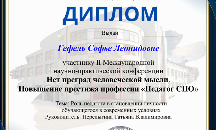 Победа во II Международной научно-практической конференции «Нет преград человеческой мысли. Повышение престижа профессии «Педагог СПО»»