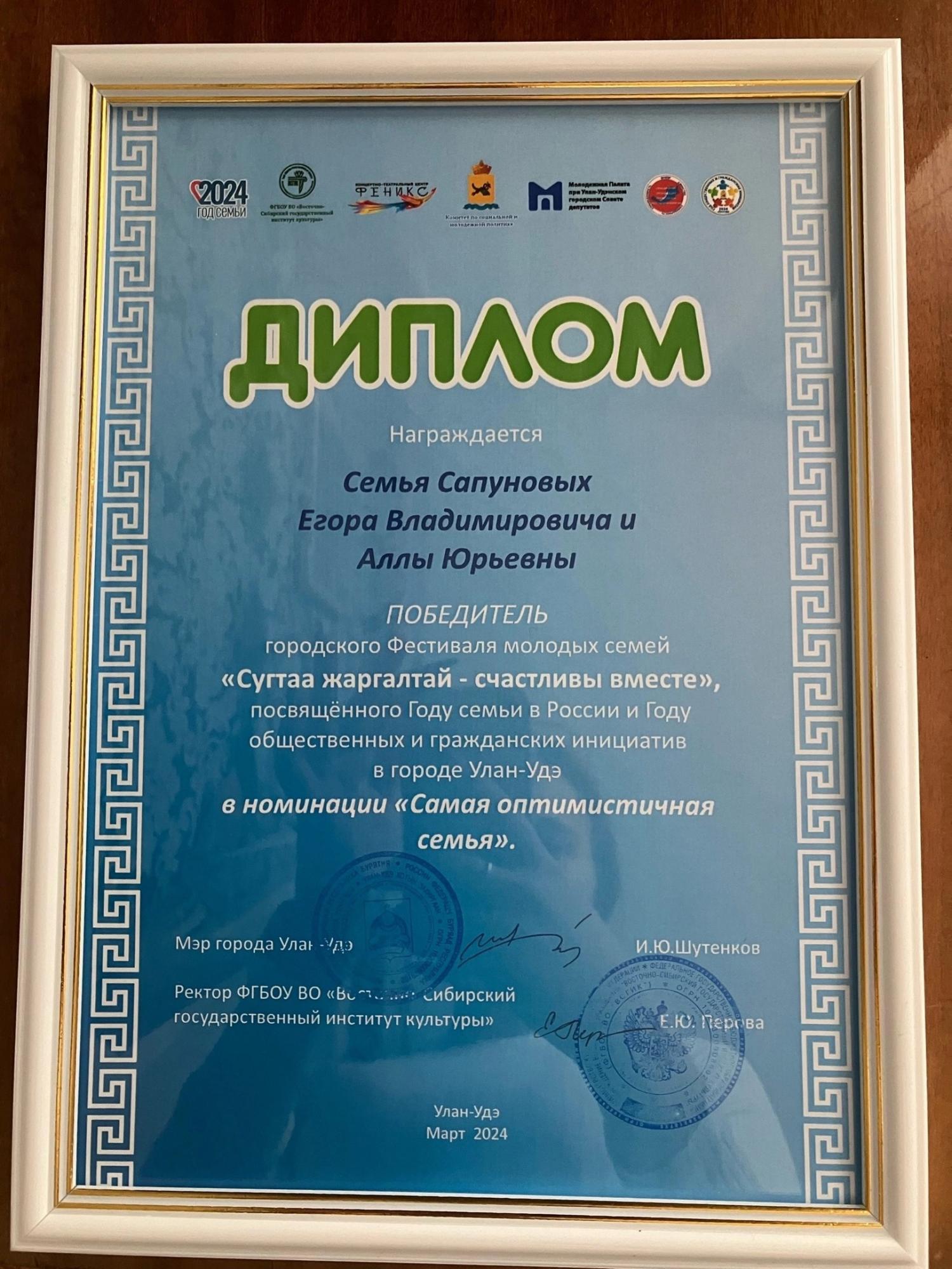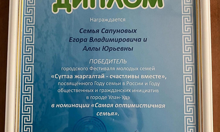 В номинации «Самая оптимистичная семья» награду получила молодая семья Сапуновых, Егор и Алла. Приз получали мама – студентка Улан-Удэнского колледжа железнодорожного транспорта, с дочкой – Аделиной, папа – военнослужащий, сейчас находится на СВО.