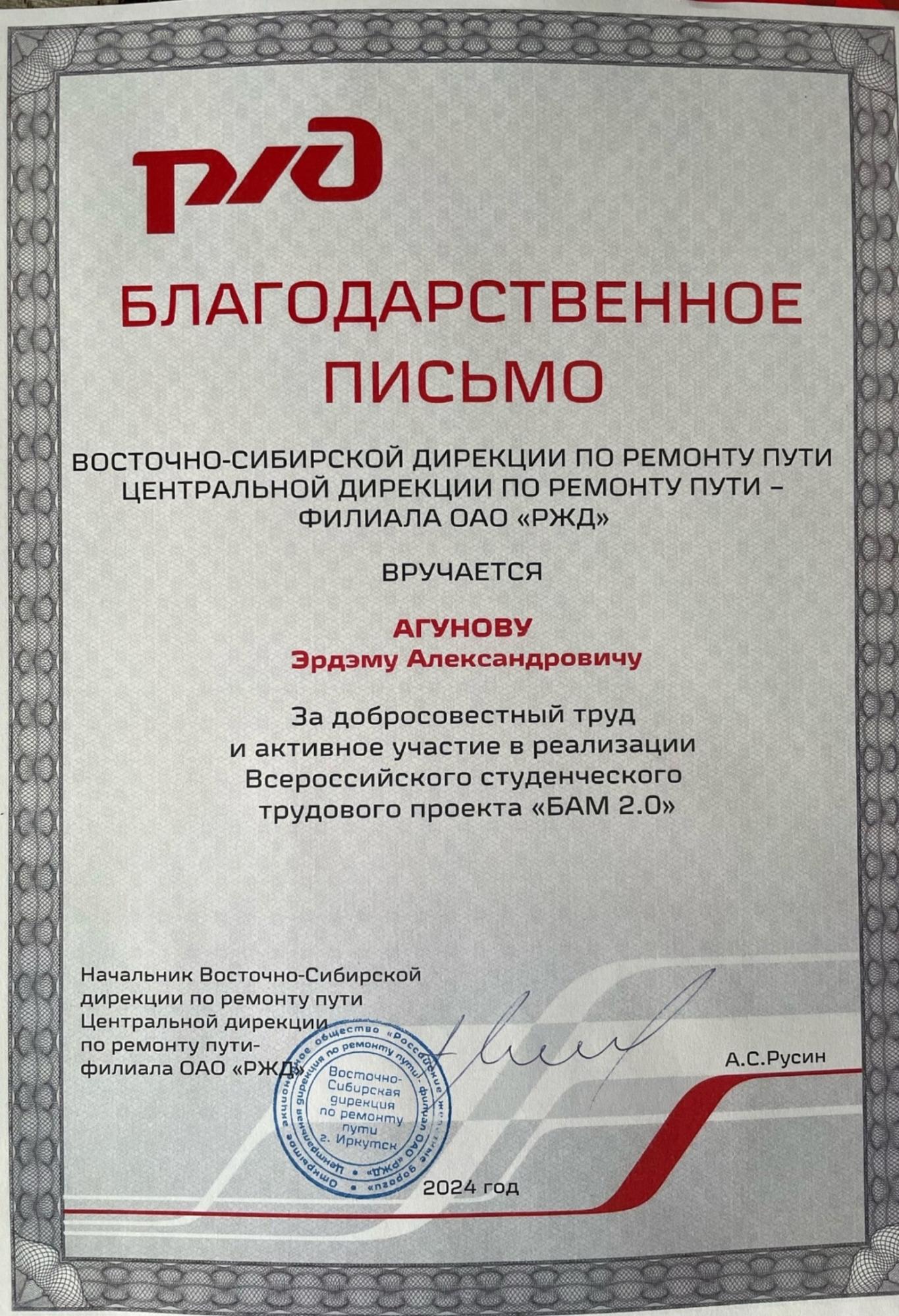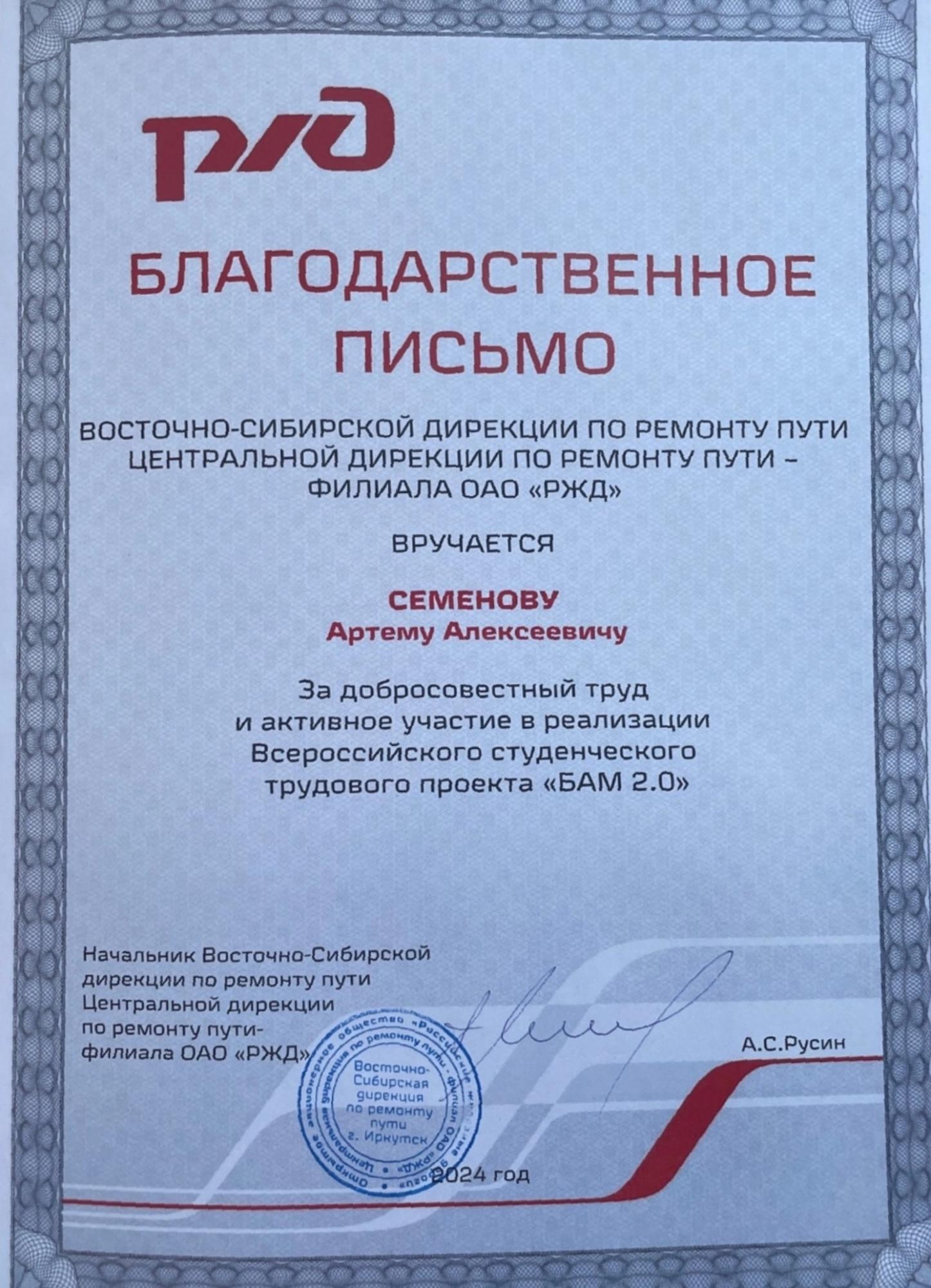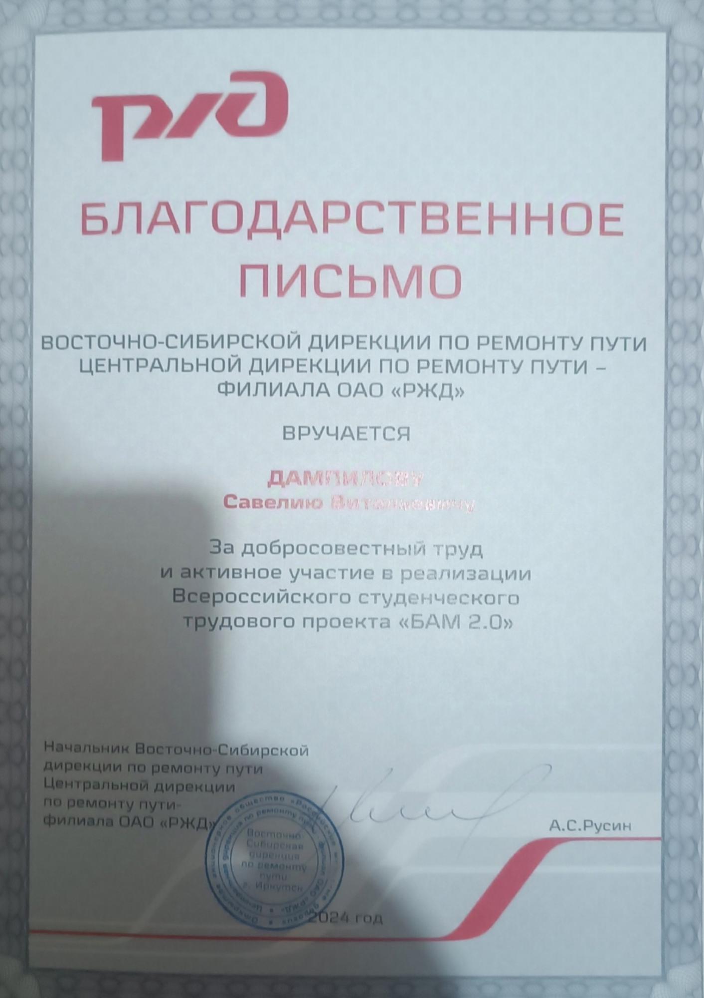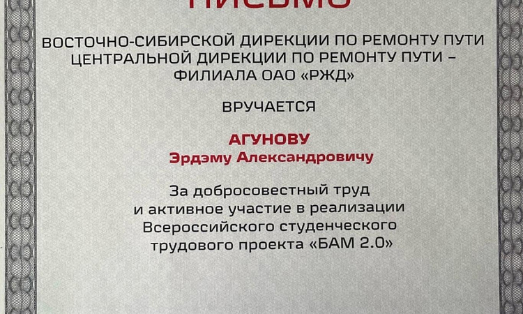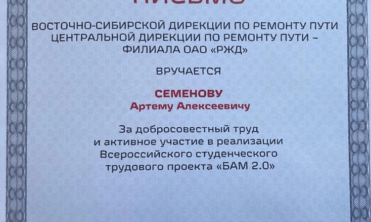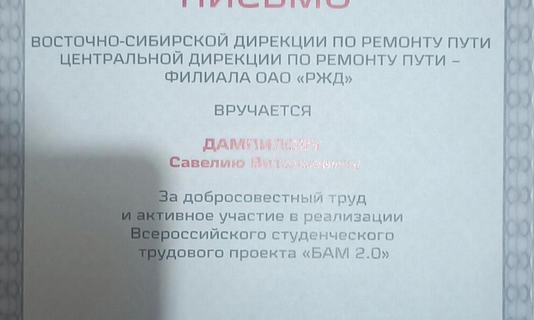 Студенты УУКЖТ ИрГУПС награждены благодарственными письмами Восточно- Сибирской дирекции по ремонту пути