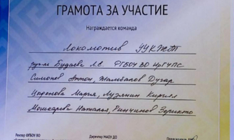 Студенты УУКЖТ ИрГУПС приняли в них участие, показав достойный результат- 13 место из 24 команд со школ, колледжей Бурятии. Наша команда называлась -Локомотив. Состав команды- 6 человек. Руководитель- Будаева Л.Е.