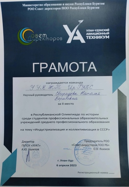 Поздравляем студентов Улан-Удэнского колледжа железно-дорожного транспорта – филиала ФГБОУ ВО ИрГУПС, занявших 2 командное место в Республиканской олимпиаде по истории, которая состоялась 06 апреля 2023 г. на базе Улан-Удэнского авиационного техникума.