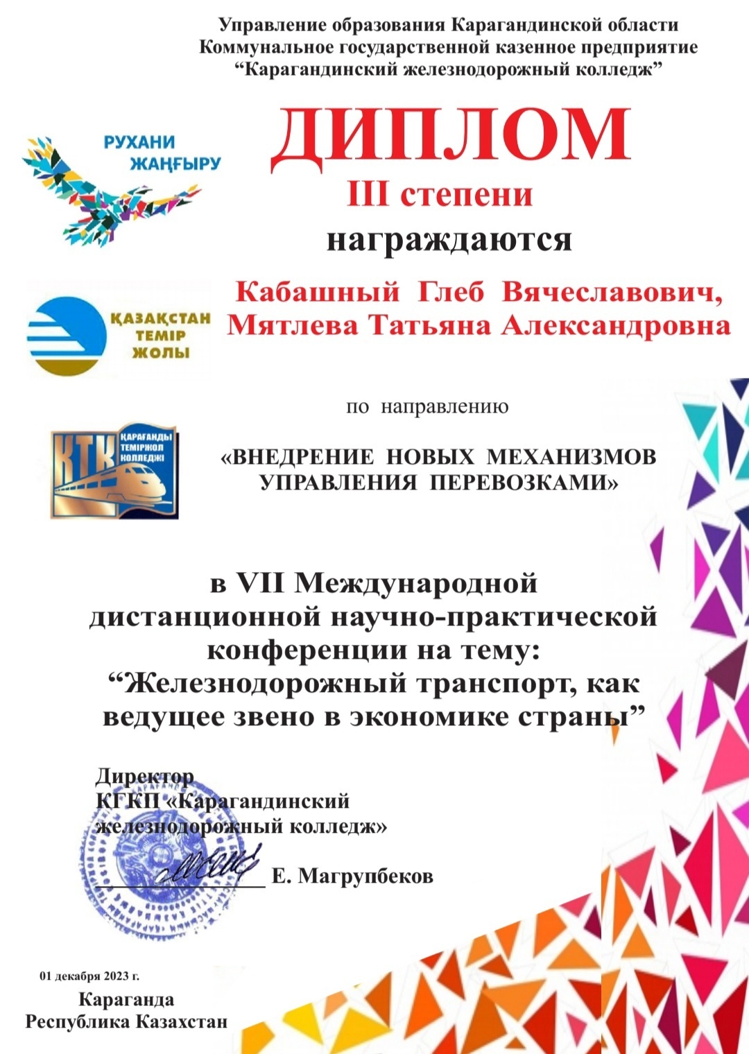 Продолжаем публикацию дипломов, которыми награждены наши студенты на Международной дистанционной научно- практической конференции в республике Казахстан.