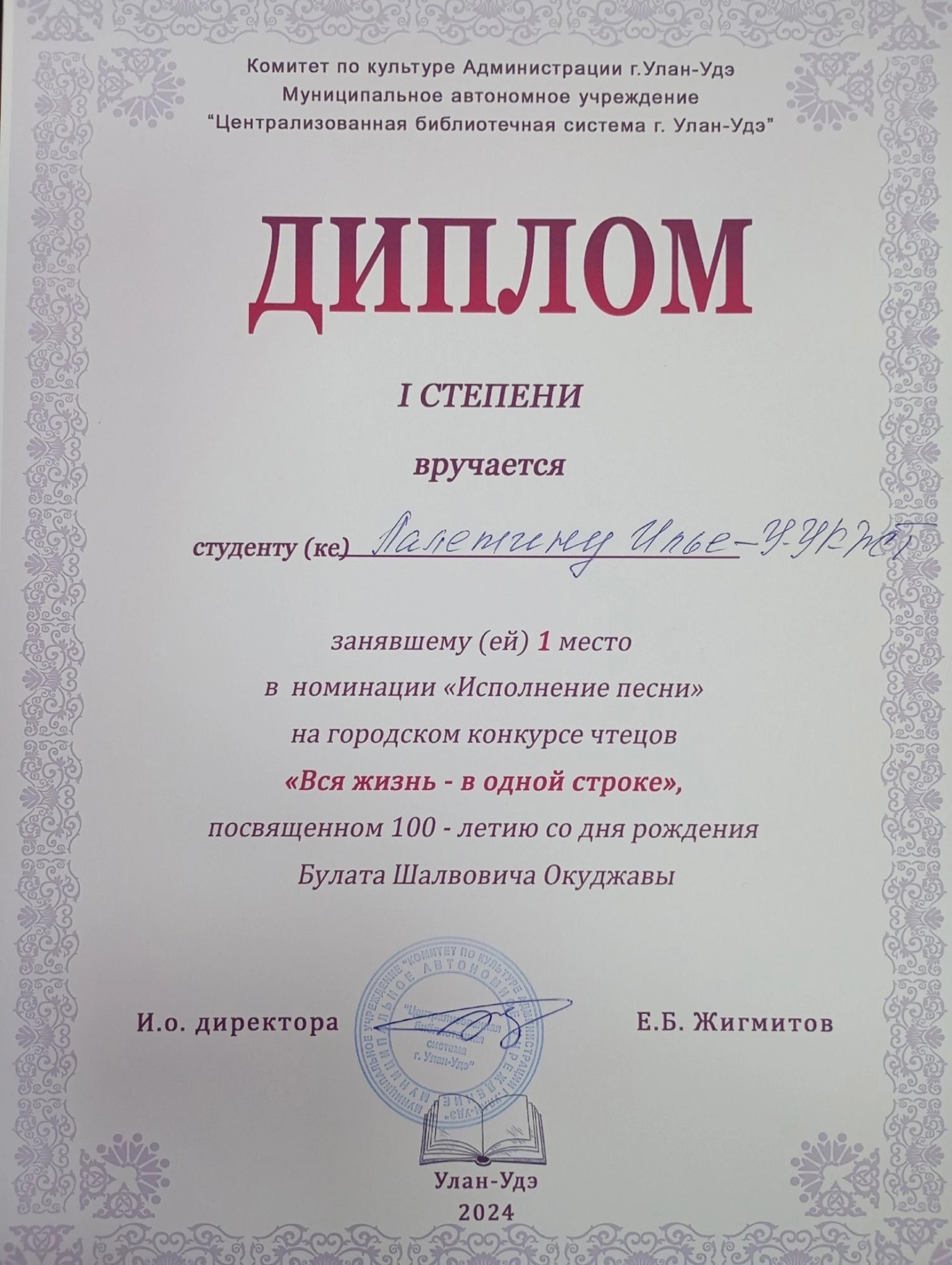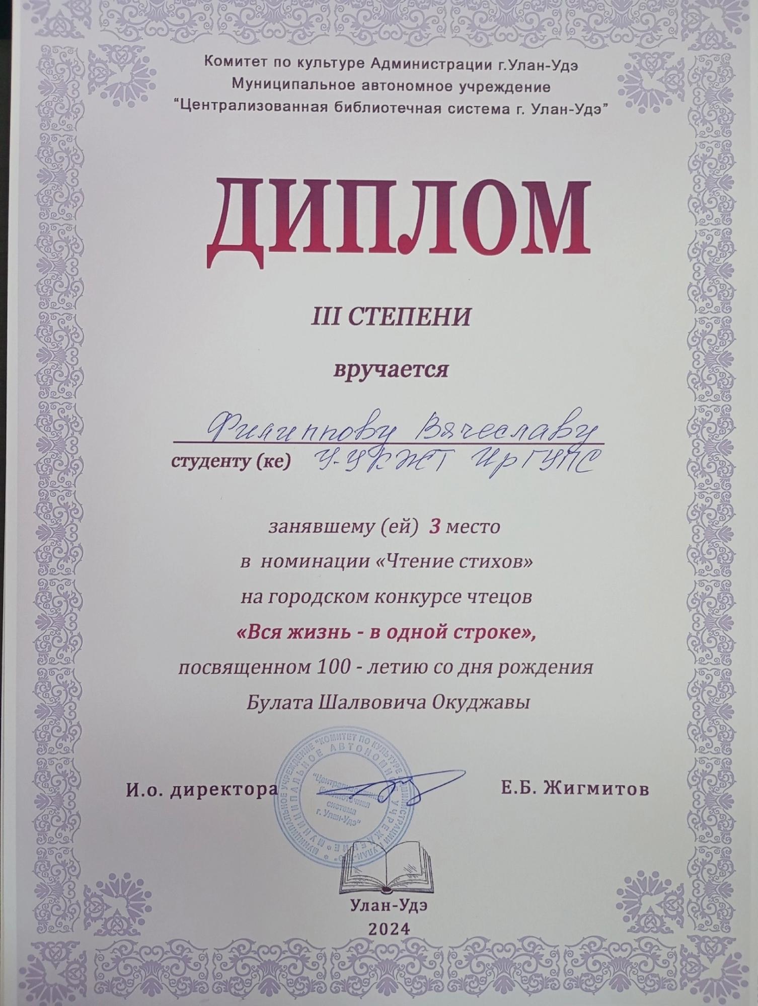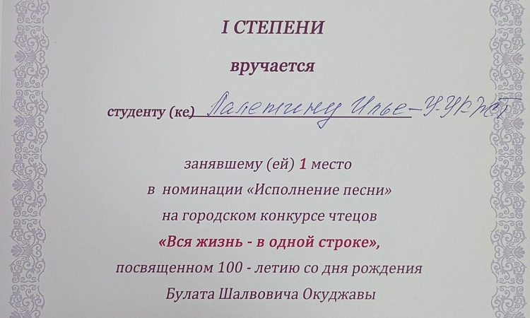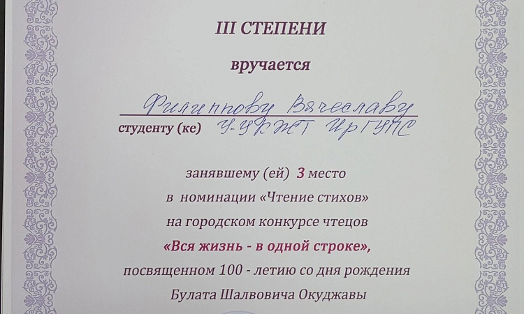 Студенты УУКЖТ ИрГУПС успешно приняли участие в городском конкурсе чтецов "Вся жизнь в одной строке" , посвященном 100- летию со дня рождения Булата Окуджавы, заняв 1 место в номинации "Исполнение песни"- Лалетин Илья, Аскаров Роман, 3 место в номинации "Чтение цехов"-Филиппов Вячеслав. Руководитель -Бердникова А. А. Поздравляем! Молодцы!