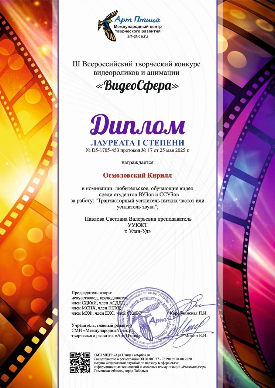 III Всероссийский творческий конкурс видеороликов и анимации "ВидеоСфера" порадовал наших студентов за их творческие работы дипломами I степени.
