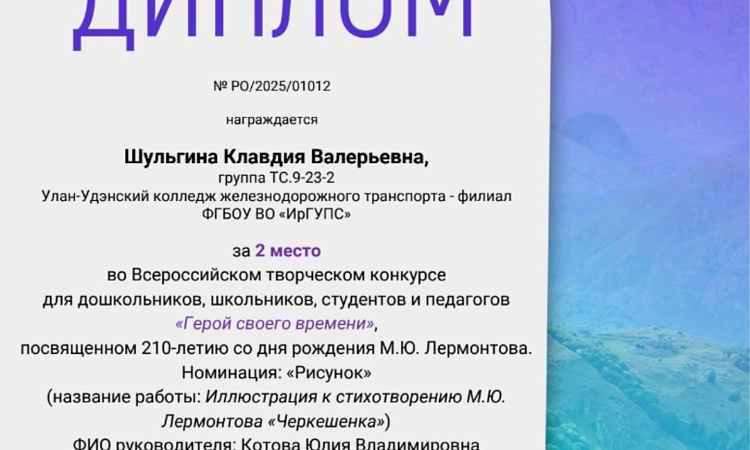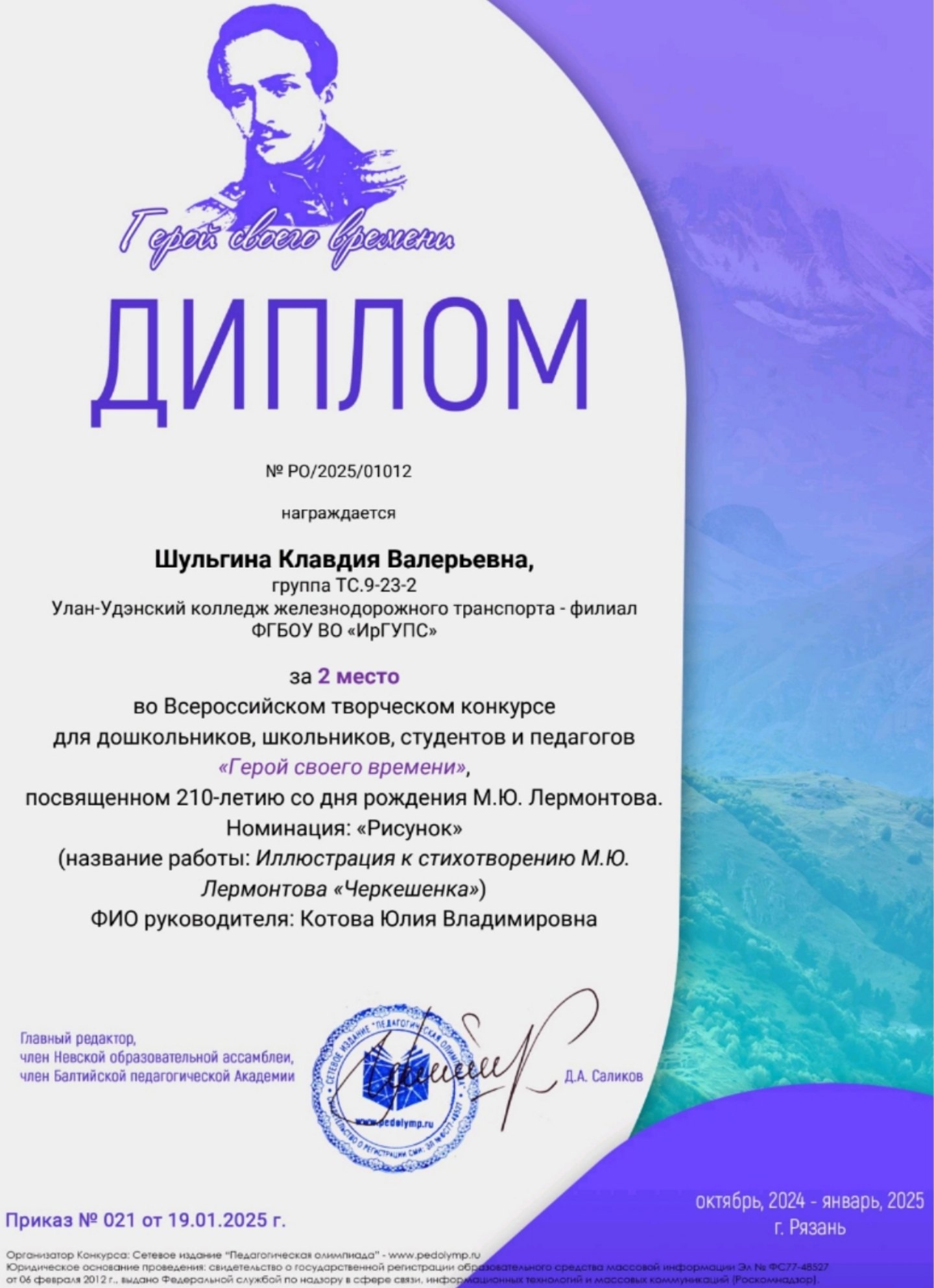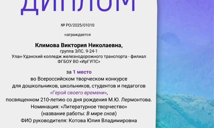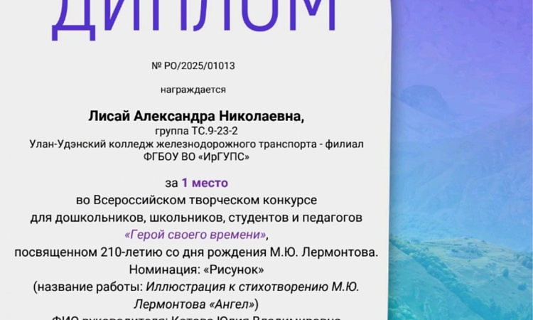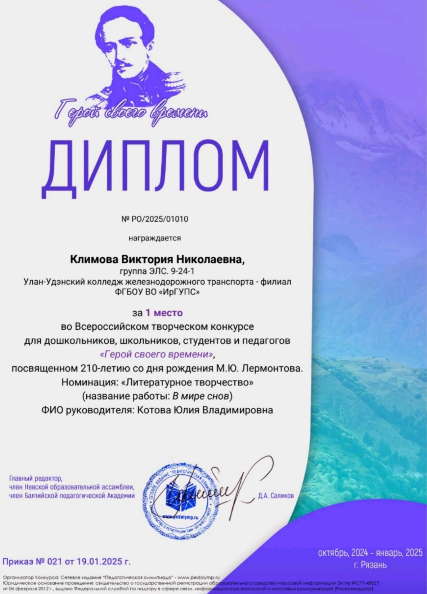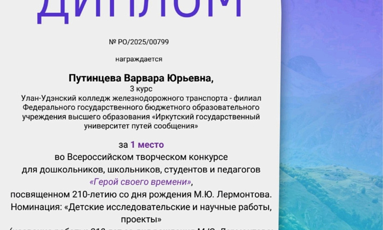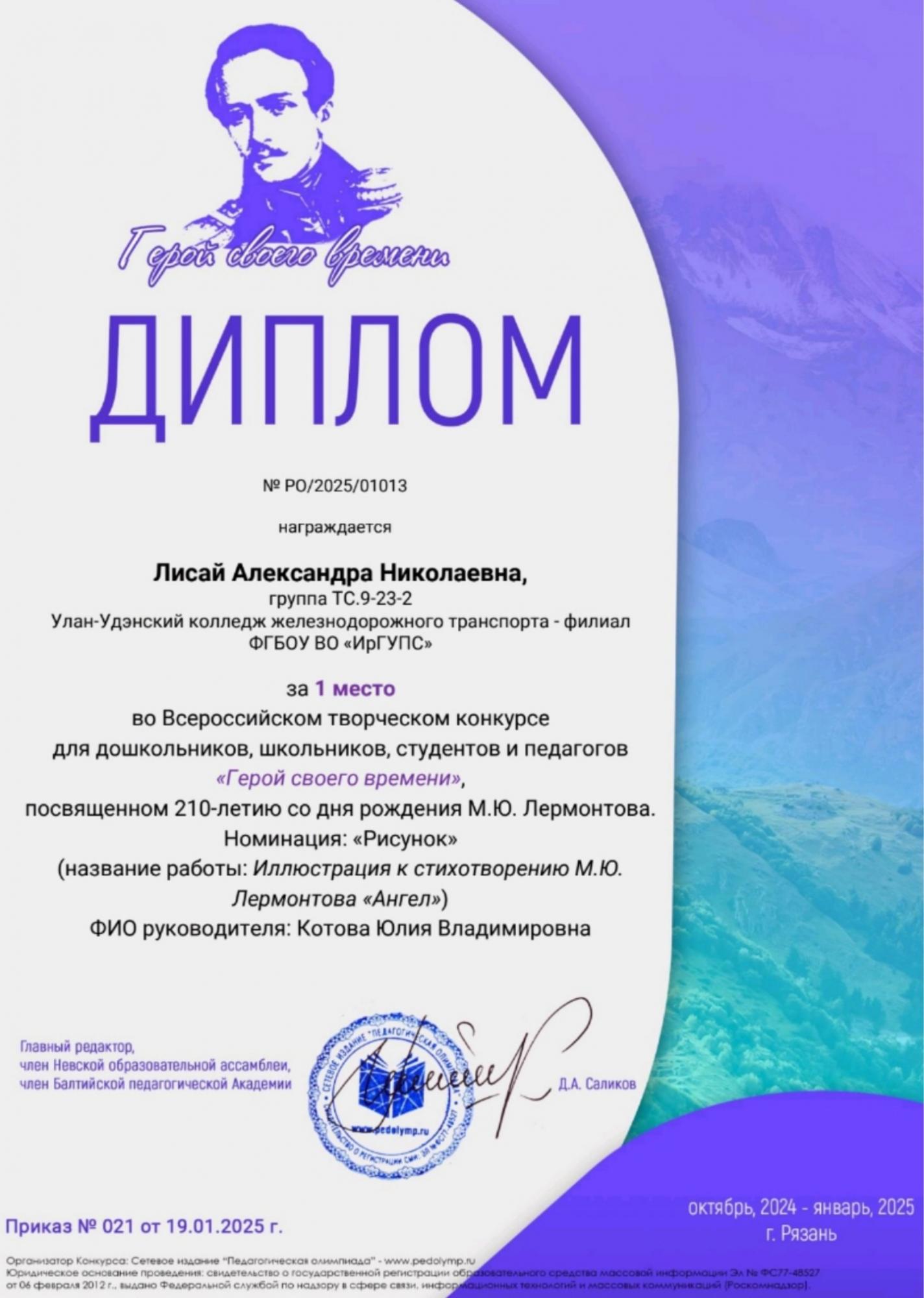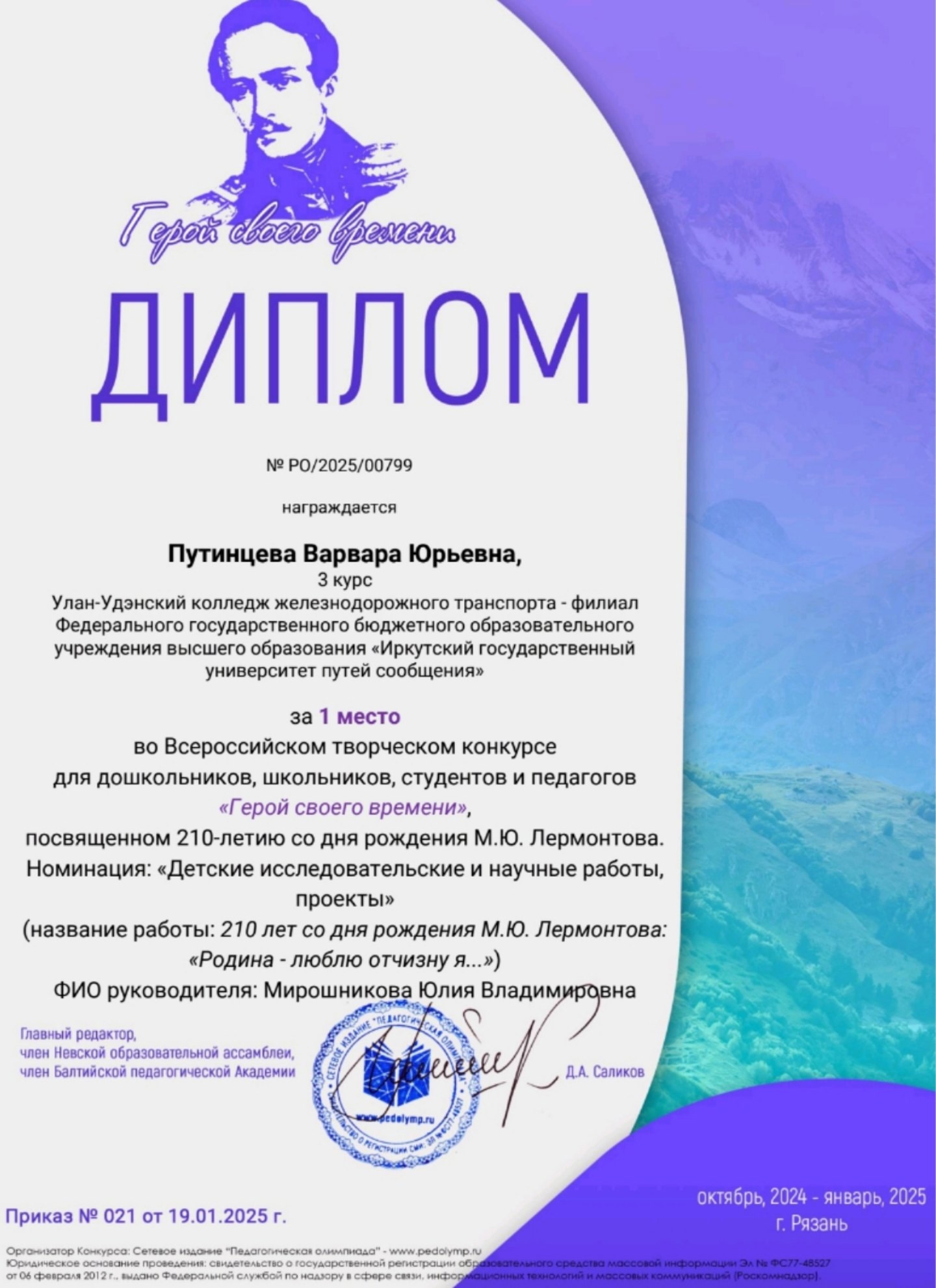 Поздравляем студентов нашего колледжа Путинцеву В.Ю., Климову В.Н., Лисай А.Н и Шульгину К.В., а также научных руководителей Мирошникову Ю.В. и Котову Ю.В. с успешным участием во Всероссийском творческом конкурсе для дошкольников, школьников, студентов и педагогов «Герой своего времени», посвященном 210-летию со дня рождения М.Ю. Лермонтова.