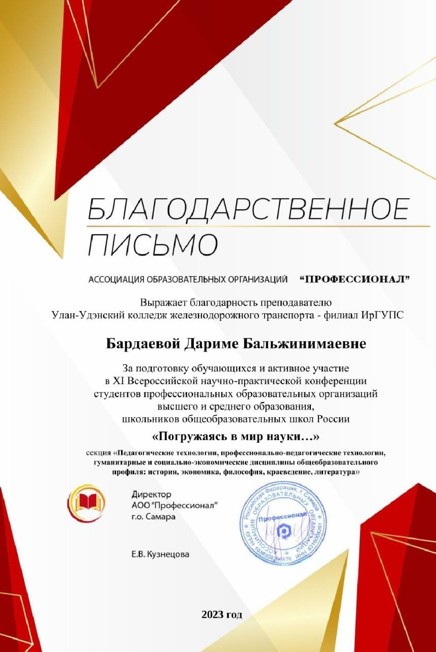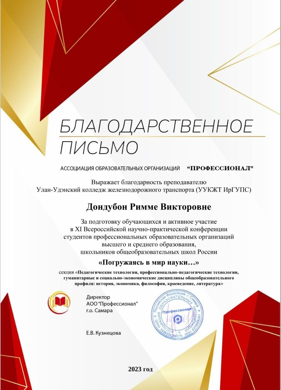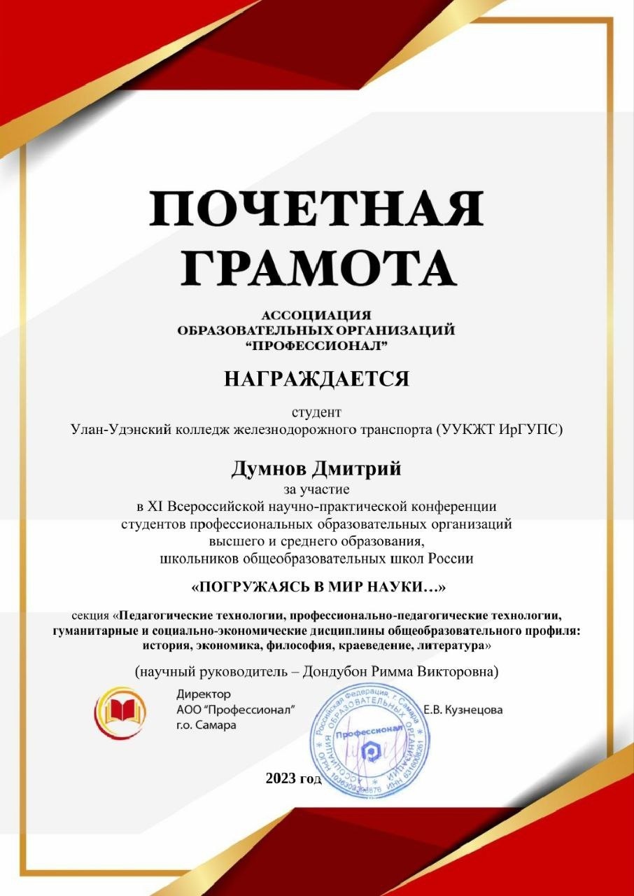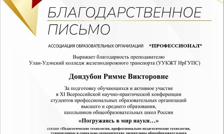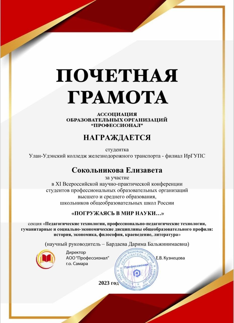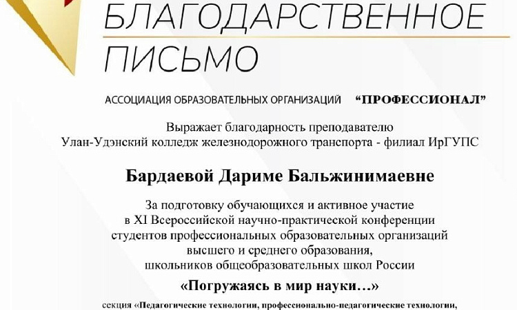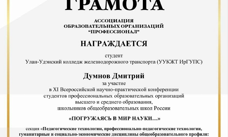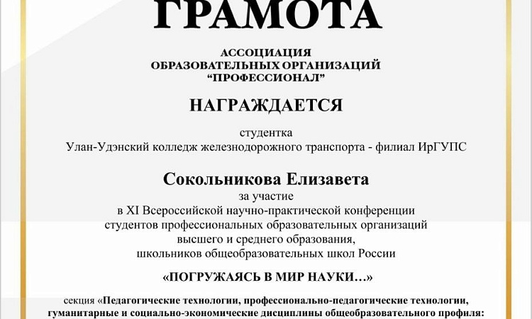 Поздравляем студентов УУКЖТ ИрГУПС Думнова Дмитрия и Сокольникову Елизавету, руководителей Бардаеву Дариму Бальжинимаевну и Дондубон Римму Викторовну с успешным участием в Xl Всероссийской научно-практической конференции "Погружаясь в мир науки... "!