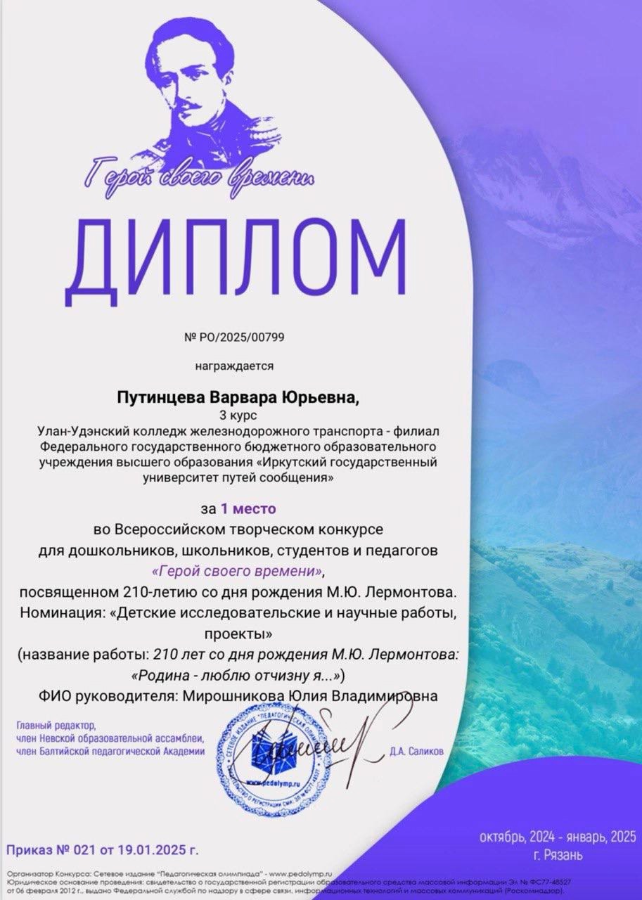 Путинцева Варвара заняла 1 место во Всероссийском творческом конкурсе «Герой своего времени».