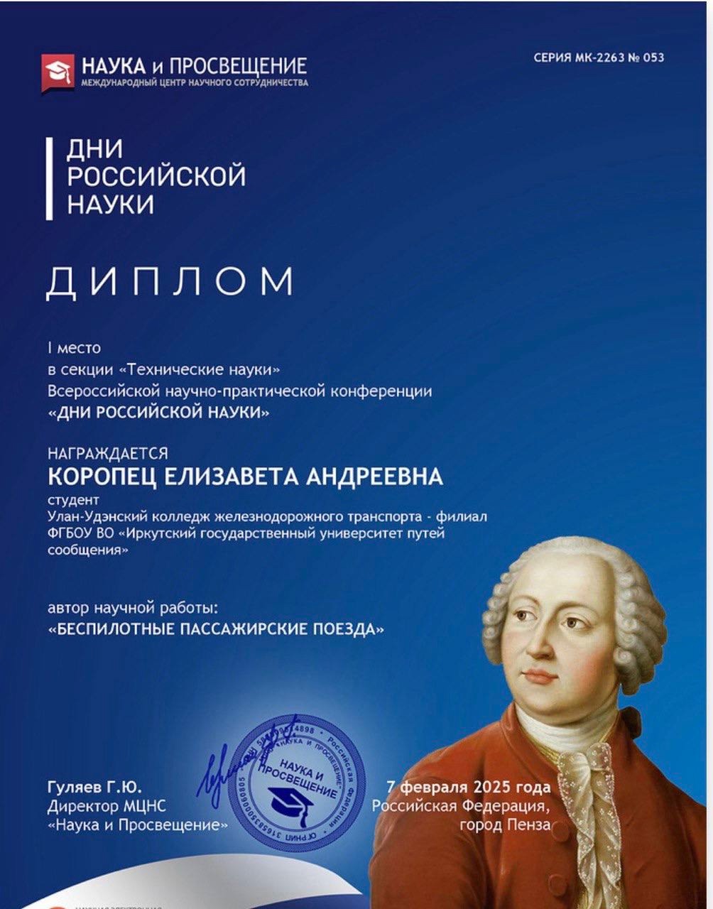 1 место Коропец Елизавета-«Беспилотные пассажирские поезда»
