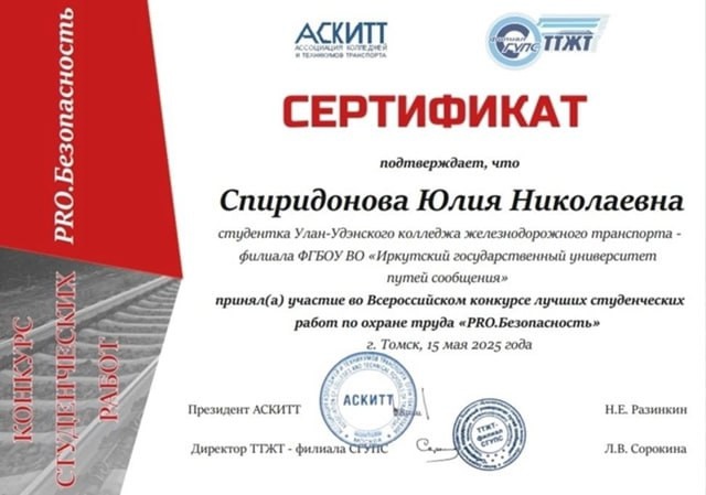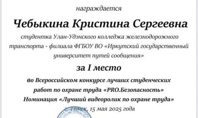 Студентка УУКЖТ ИРГУПС специальности 11.02.06 Чебыкина Кристина заняла 1-е место во Всероссийском конкурсе лучших студенческих работ по охране труда "PRO.Безопасность" в номинации "Лучший видеоролик по охране труда", организаторами которой выступил Томский техникум железнодорожного транспорта и АСКИТТ. Руководитель- Дегтярева А. Ф!.