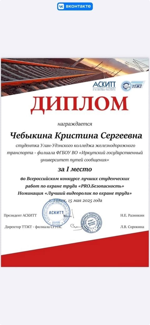Студентка УУКЖТ ИРГУПС специальности 11.02.06 Чебыкина Кристина заняла 1-е место во Всероссийском конкурсе лучших студенческих работ по охране труда "PRO.Безопасность" в номинации "Лучший видеоролик по охране труда", организаторами которой выступил Томский техникум железнодорожного транспорта и АСКИТТ. Руководитель- Дегтярева А. Ф!.