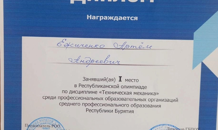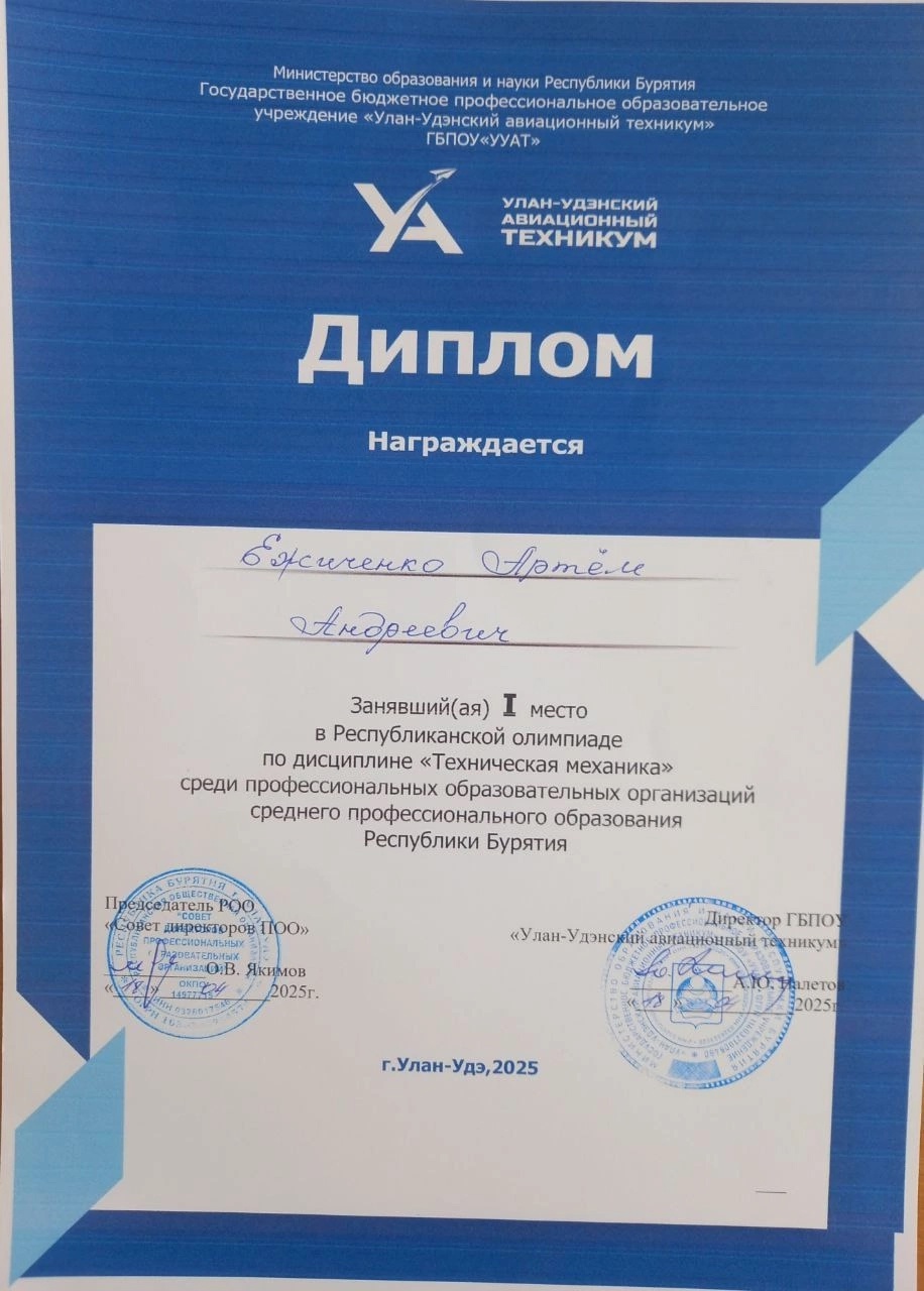 18 апреля состоялась Республиканская олимпиада по технической механике среди студентов ПОЛ РБ. Она проходила в ГБПОУ "Улан-Удэнский авиационный техникум". Улан-Удэнский колледж железнодорожного транспорта представляла команда в составе: Ежиченко Артема специальность СП Вострикова Фёдора специальность ЭПСл Поздравляем нашу команду со 2 местом.