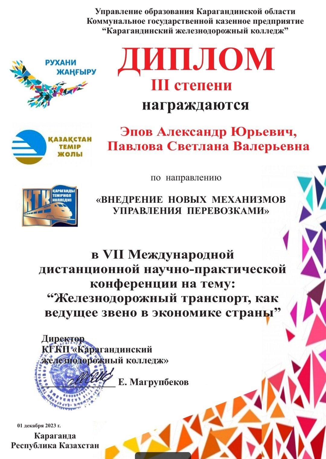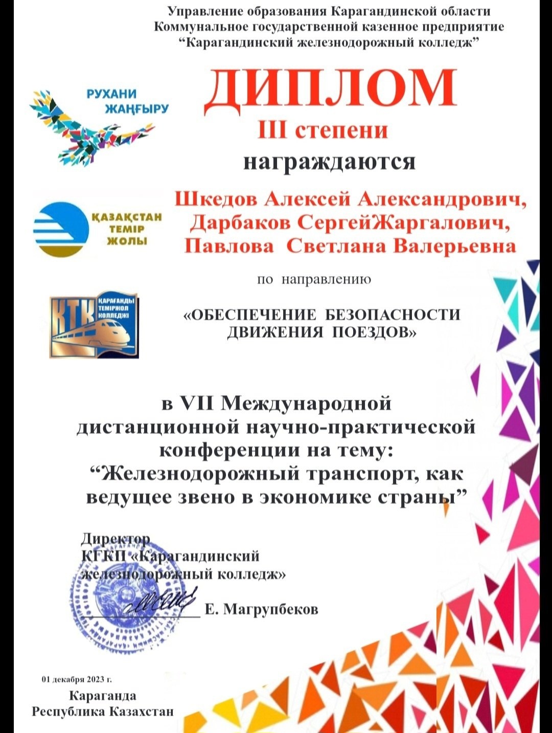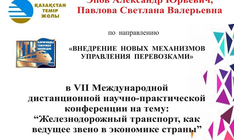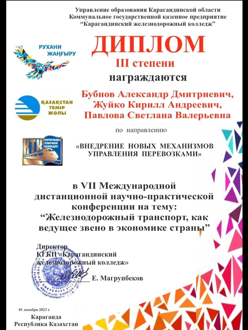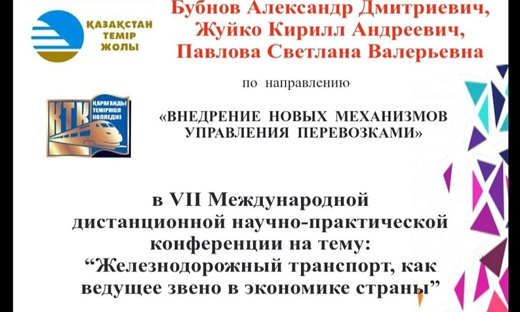 Также студегты стали победителями VII Международной дистанционной научно-практической конференции в Казахстане: Шкедов А, Дарбаков С, Бубнов А, Жуйко К, Эпов А.