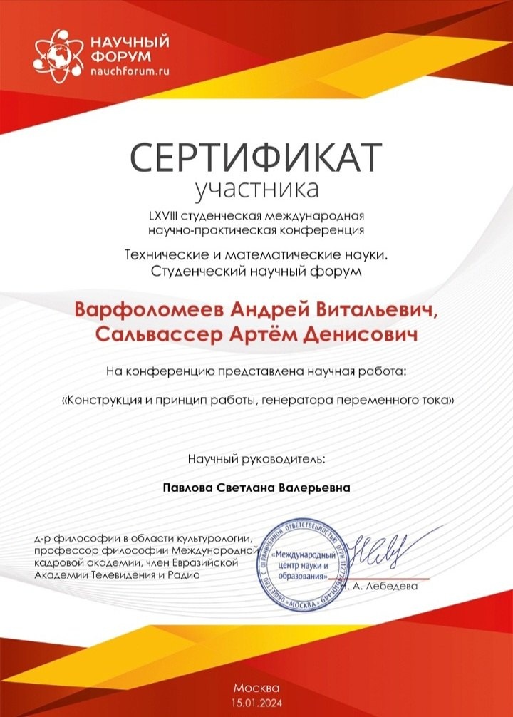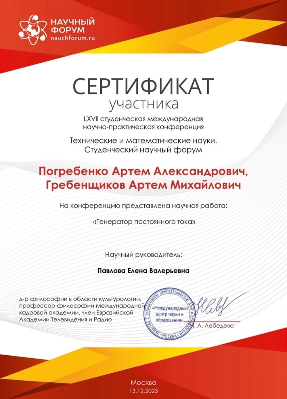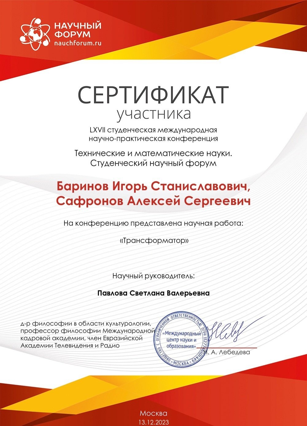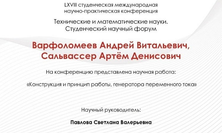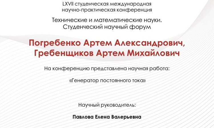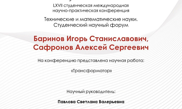 Также студегты стали победителями VII Международной дистанционной научно-практической конференции в Казахстане: Шкедов А, Дарбаков С, Бубнов А, Жуйко К, Эпов А.