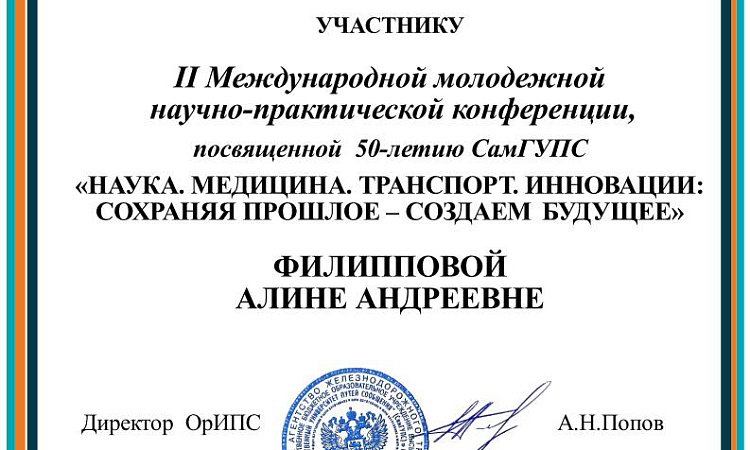 Студентка УУКЖТ специальности 43.02.06 Сервис на транспорте (по видам транспорта) Филиппова Алина приняла участие во II Международной молодёжной научно-практической конференции "Наука. Медицина. Транспорт.