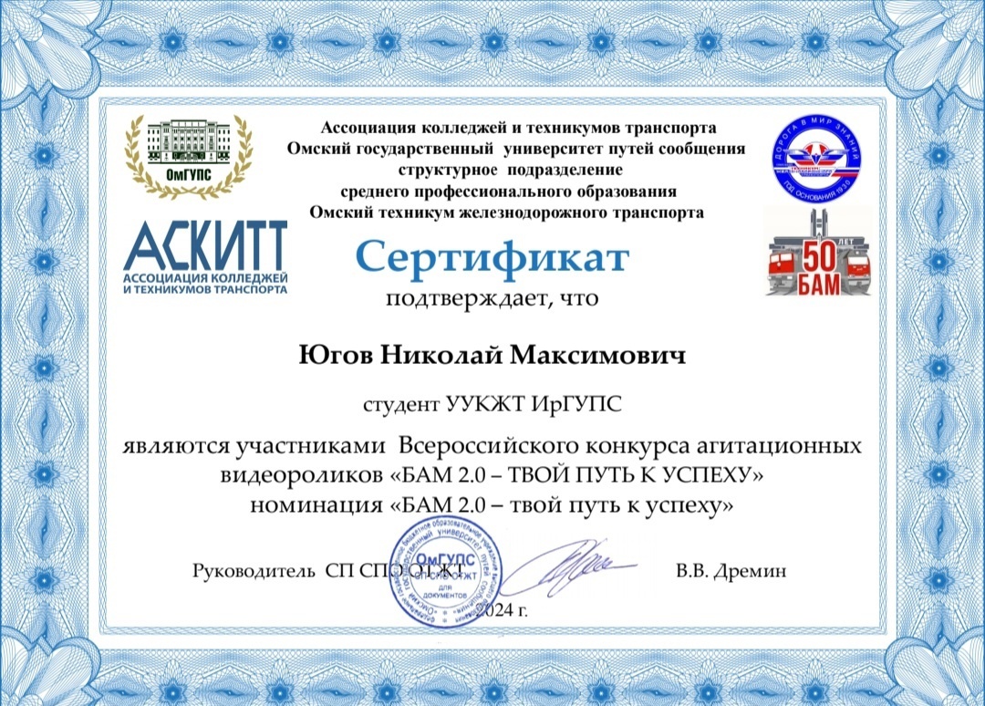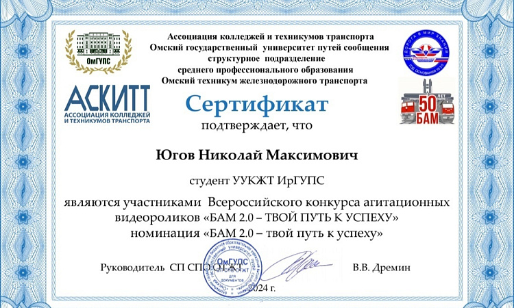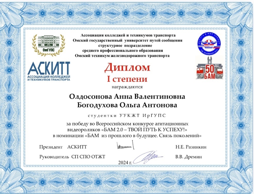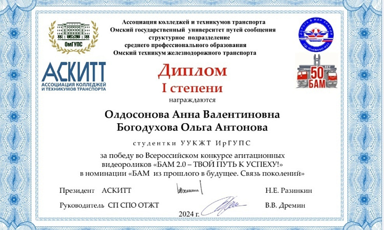 Студенты УУКЖТ ИрГУПС приняли участие в конкурсе агитационных видеороликов, заняв под руководством Мурзиной Г.В. , 1 место в номинации "БАМ из прошлого в будущее. Связь поколений".