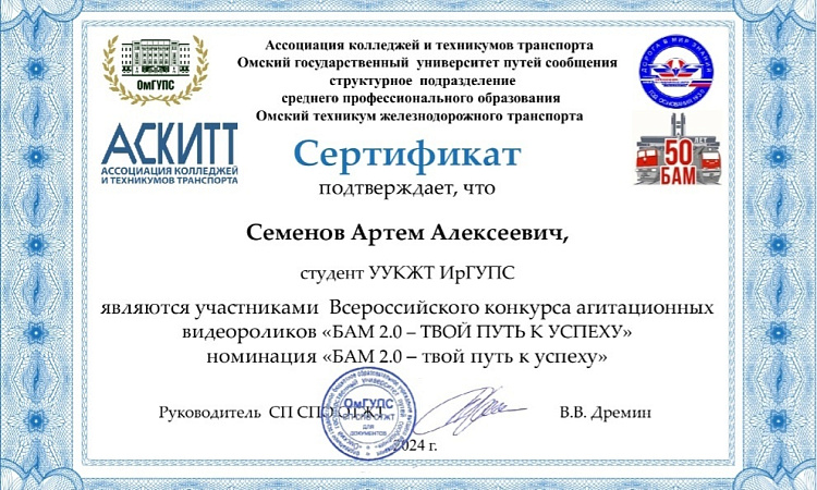Благодарим участников Семенова А.А, Югова Н.М студентов специальности Техническая эксплуатация подвижного состава железных дорог (локомотивы) за участие!