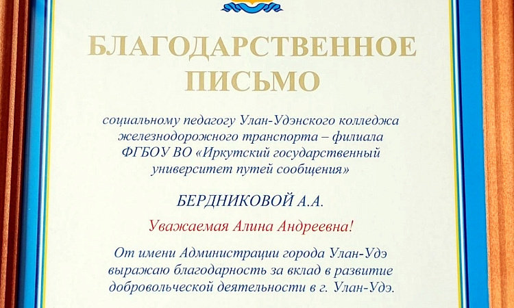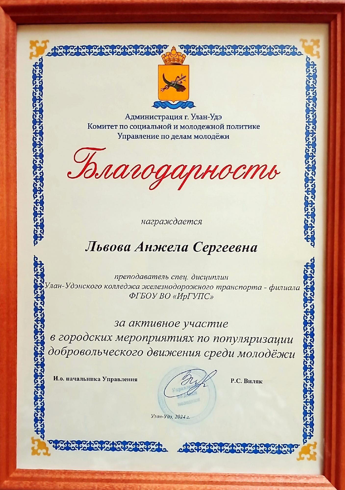 В Администрации г. Улан-Удэ 5 декабря состоялся круглый столна тему "Об итогах деятельности волонтерских объединений за 2024 год и задачи на 2025 год" . Представители УУКЖТ ИрГУПС присутствовали на этом мероприятии и были награждены благодарственными письмами мэра города Улан-Удэ и администрации города Улан-Удэ: