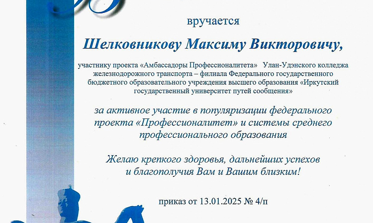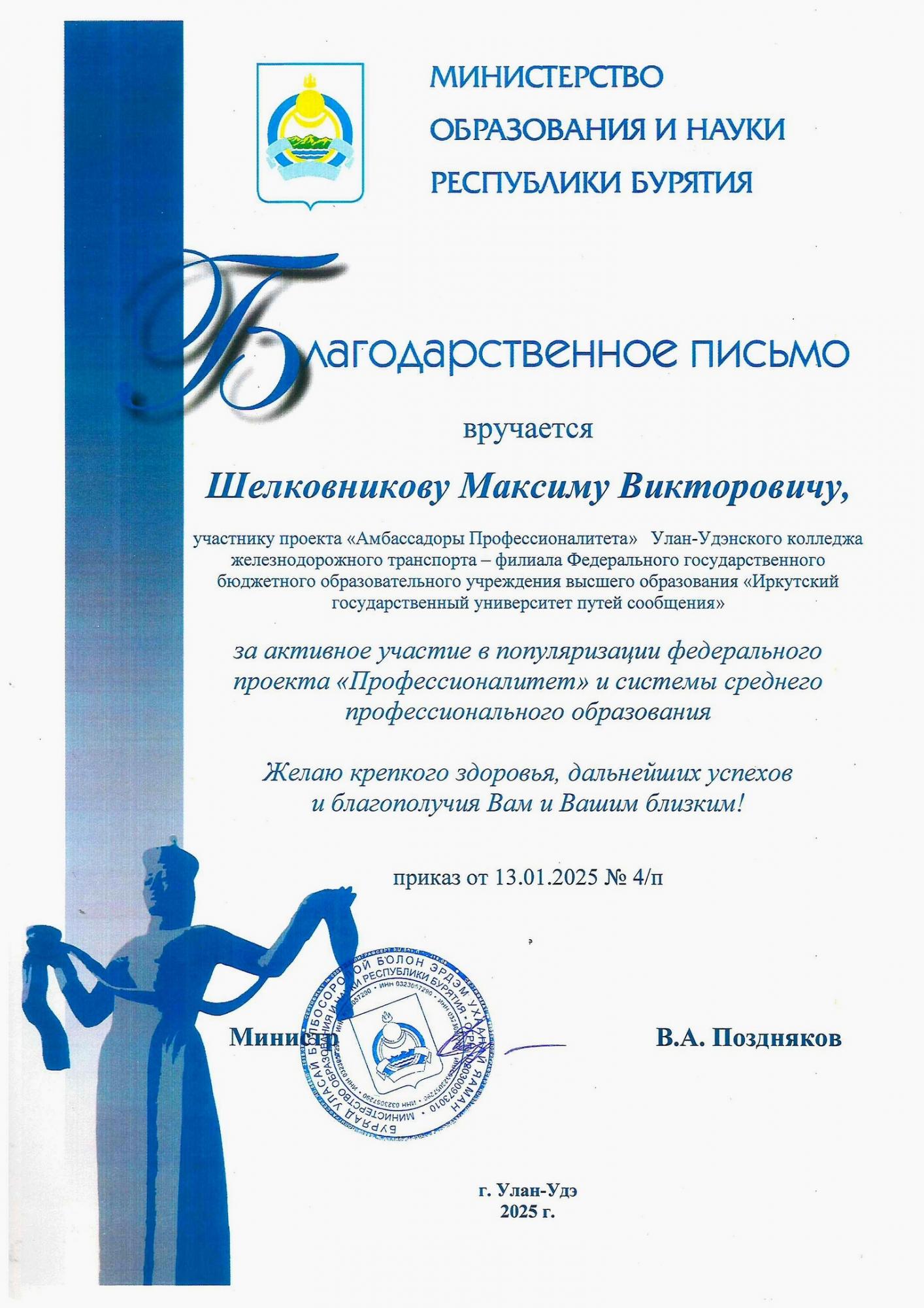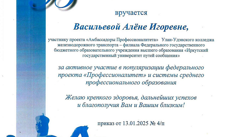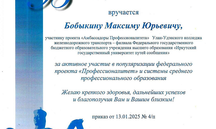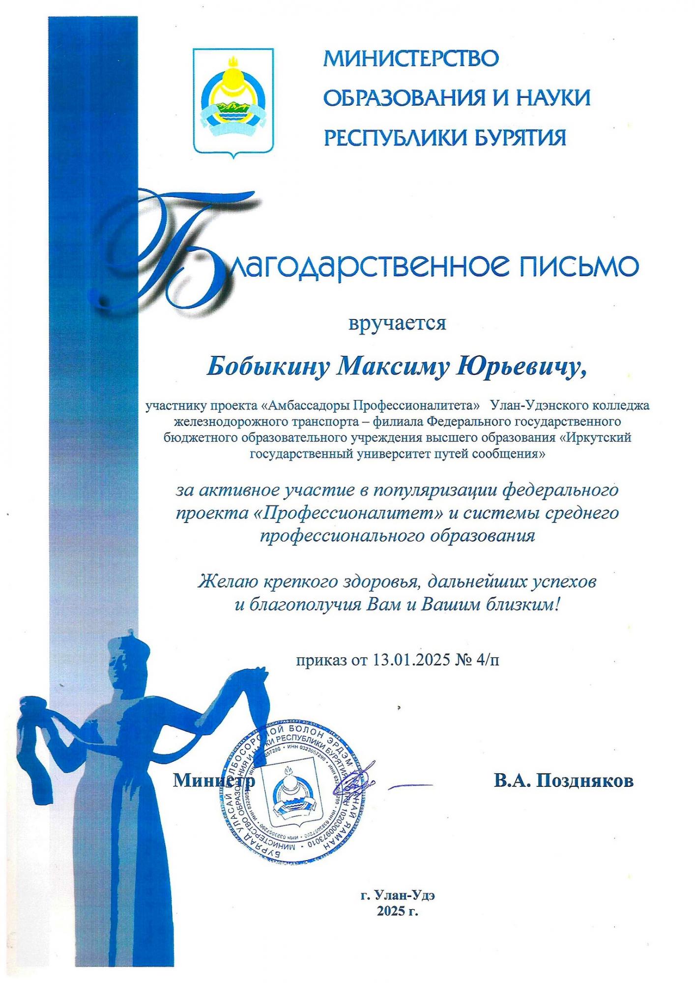 20 января в Министерстве образования и науки Республики Бурятия прошло торжественное награждение амбассадоров федерального проекта «Профессионалитет» Улан-Удэнского колледжа железнодорожного транспорта.