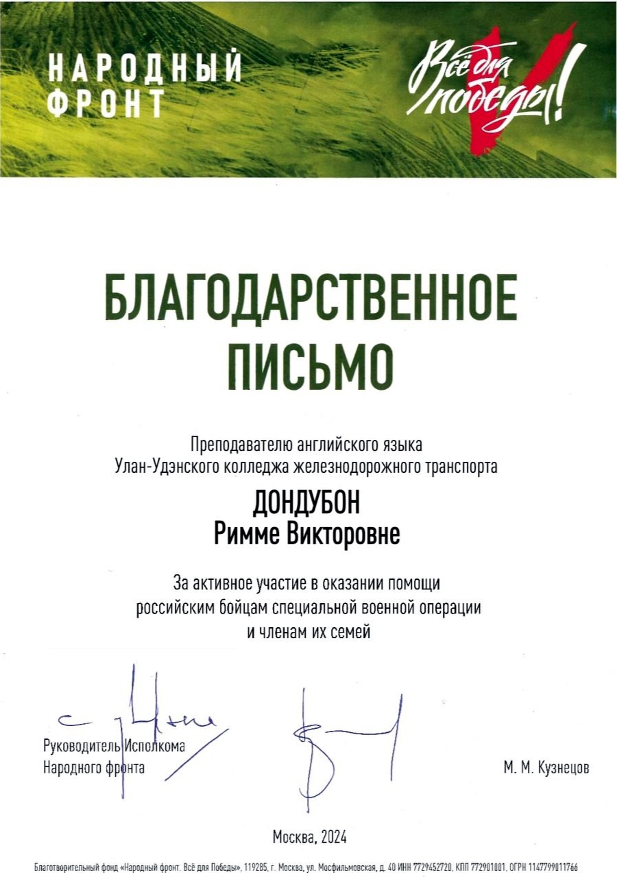 Дондубон Римма Викторовна награждена благодарственным письмом за активное участие в оказании помощи российским бойцам РСО и членам из семей