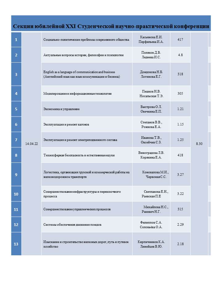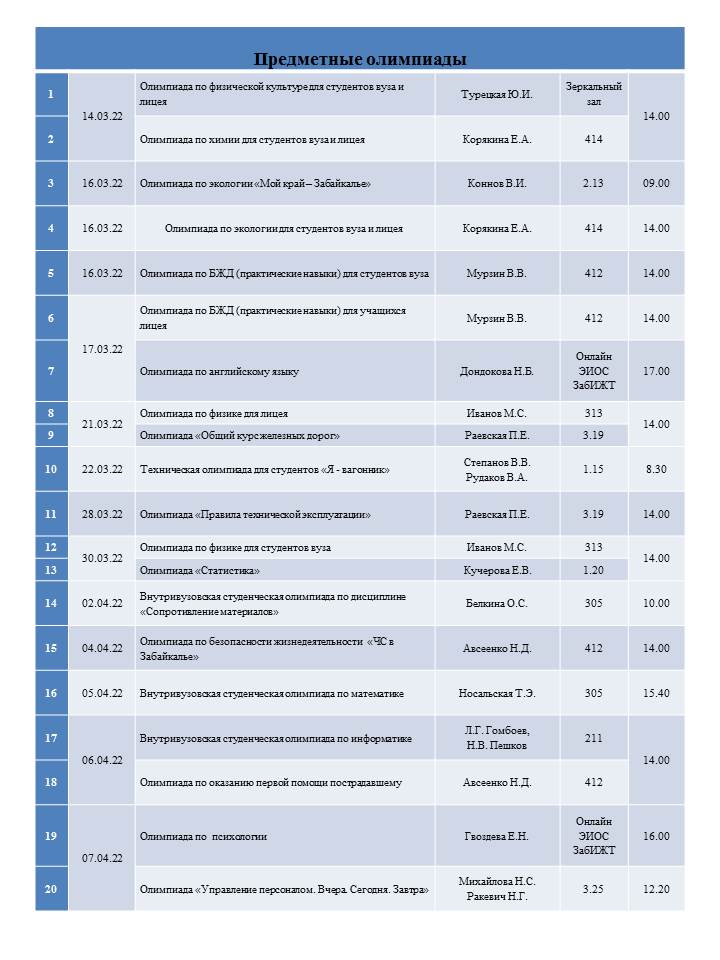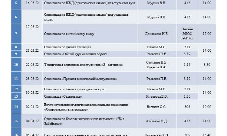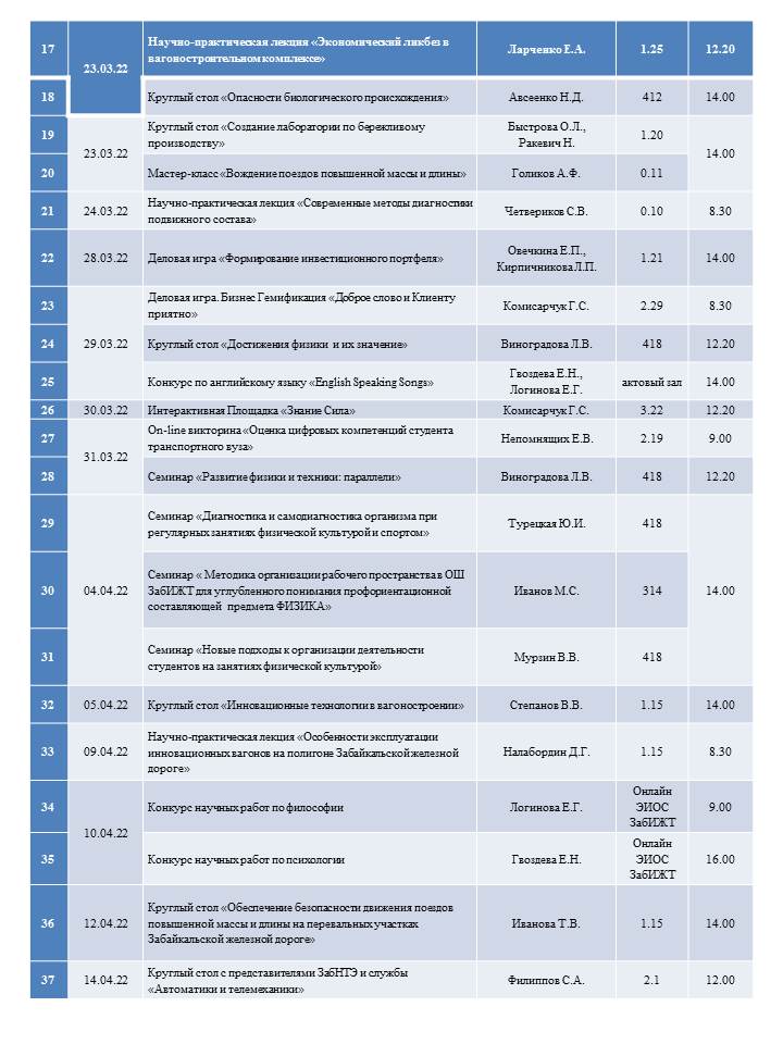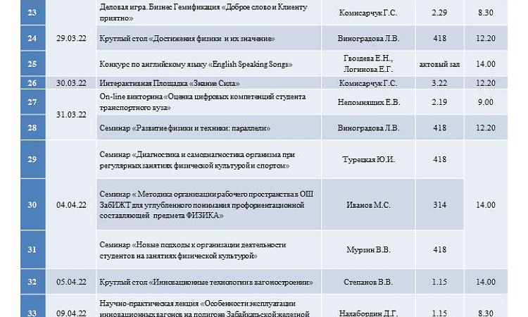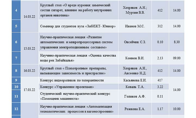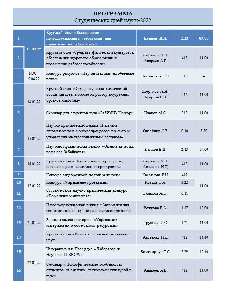 В период с 14 марта по 14 апреля 2022г. в рамках Дней студенческой науки в Забайкальском институте железнодорожного транспорта пройдет более 60 мероприятий.