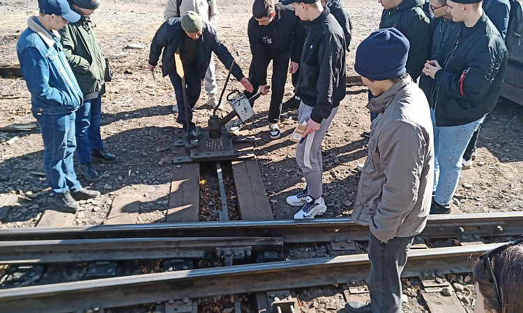 После инструктажа по охране труда, технике безопасности и безопасности производства путевых работ участники мастер-класса вышли на перегон, где их уже ждали путейская бригада с интересными заданиями. Первым этапом занятия стало обследование стрелочного перевода с применением путевого шаблона, штангенциркуля и шаблона КОР. Будущие инженеры-строители проверяли ширину колеи, положение рельсовых нитей по уровню, критические расстояния в крестовине, шаг остряка, желоба, зазоры, ступеньки в рельсовых стыках и др. После всех измерений соответствующие записи были занесены в Книгу записи результатов проверки стрелочных переводов и глухих пересечений (Формы ПУ-29). Дальнейший план мероприятия предполагал проведение работ по выправке пути укладкой пучинных карточек. Студенты познакомились с критериями назначения этой работы, правилами безопасного ее проведения, инструментом и технологией. Самым отважным доверили забивать костыли после укладки карточек. В финальной части занятия состоялось знакомство с новым рельсорезным станком РР-80. Монтеры пути продемонстрировали скорость резки рельсов и качество реза. После полевых работ состоялось заседание с обсуждением норм по смене шпал, выправке пути и других работ выполняемых монтерами пути за один день.