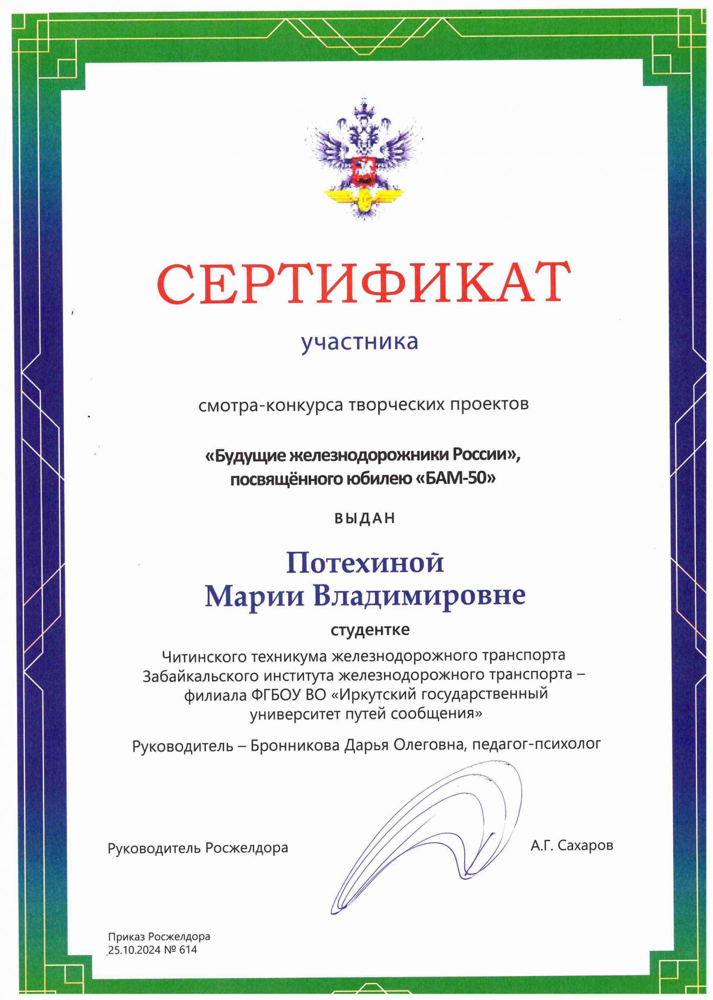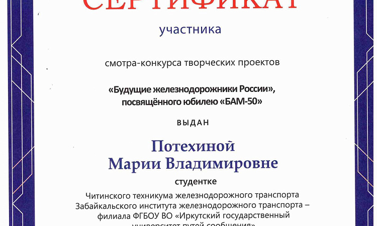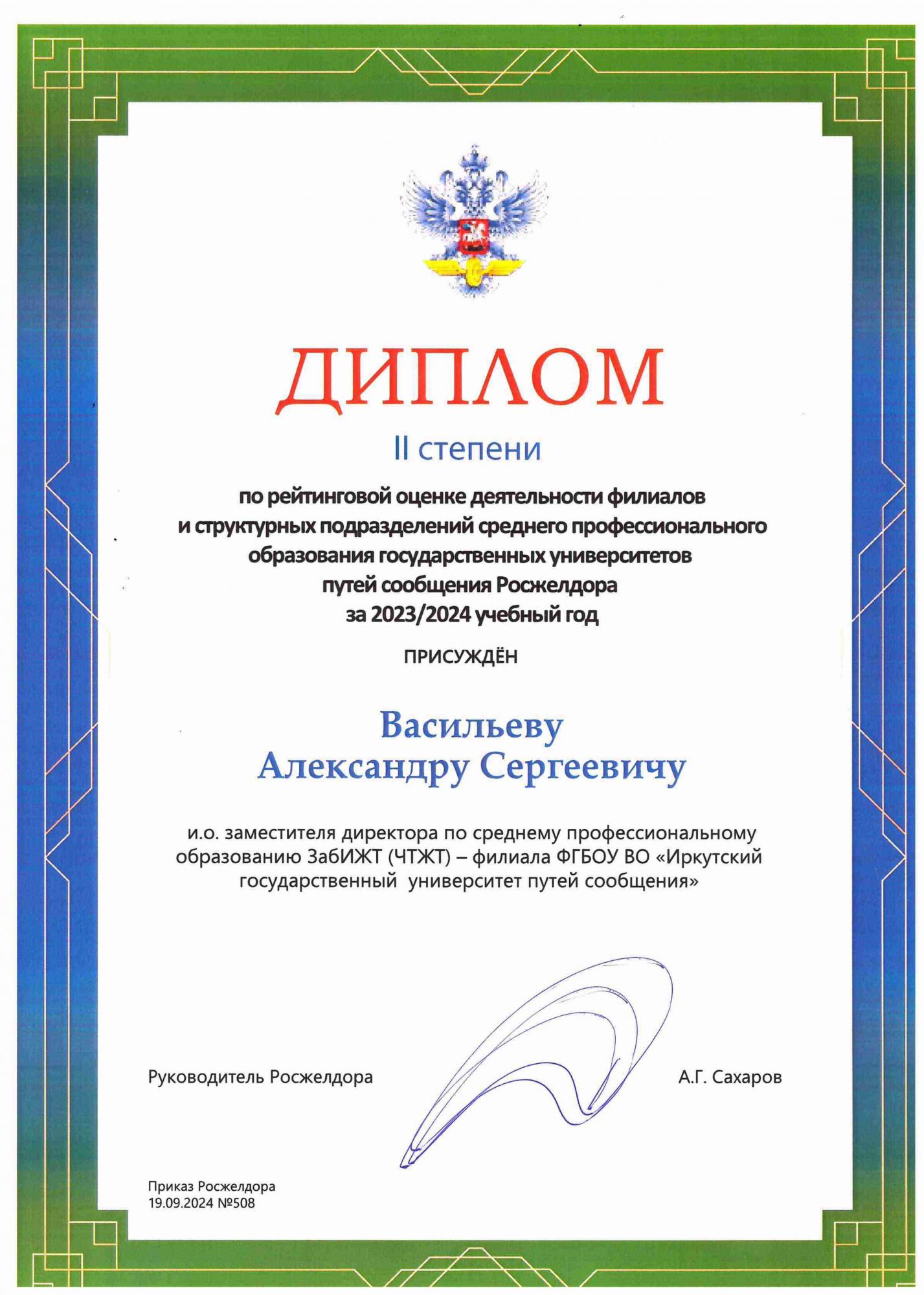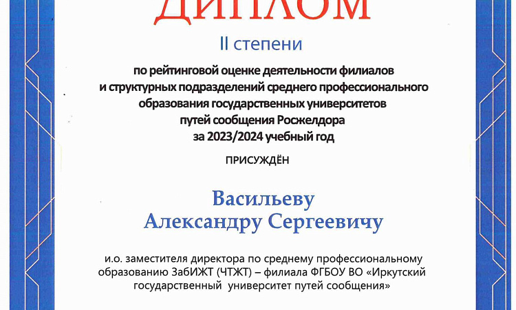 Завершился форум Торжественной церемонией вручения дипломов победителей колледжам и техникумам, подготовившим победителей II Всероссийского конкурса профессионального мастерства «Молодые профессионалы железных дорог» в зале «Колизей» Гостиного двора, в рамках которого был вручен диплом II степени по рейтинговой оценке деятельности филиалов и структурных подразделений СПО государственных университетов путей сообщения Росжелдора за 2023/2024 учебный год и сертификат смотра – конкурса творческих проектов «Будущие железнодорожники России», посвященного юбилею «БАМ -50» Читинскому техникуму железнодорожного транспорта (ЗабИЖТ). Награды директорам вручал Заместитель Министра транспорта К.А. Пашков.