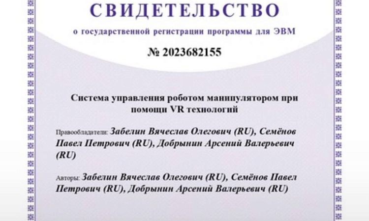 Авторы проекта «Система управления роботом-манипулятором на основе технологий виртуальной реальности» 23 октября получили свидетельство о государственной регистрации (патент). Система создаёт возможность операторам управлять роботами-манипуляторами с помощью VR-гарнитур и контроллеров, обеспечивая эффект погружения и улучшая пространственное восприятие. Главная цель разработки заключается в использовании этой системы в опасных средах, таких как атомные станции, химические заводы или морские нефтяные вышки. В подобных ситуациях применение VR-технологий поможет снизить риск несчастных случаев и травм, позволяя управлять роботом из безопасного расстояния. Система способна управлять манипуляторами с угловой и плоскопараллельной кинематикой, а также работает на протоколе HTTP/HTTPS. Для её работы требуется операционная система Windows 10, 11 x64, а языки программирования, использованные при создании - C#, C++, Python.