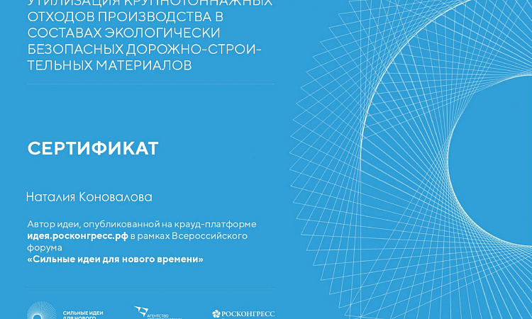 По итогам конкурсного отбора проект «Утилизация крупнотоннажных отходов производства в составах экологически безопасных дорожно-строительных материалов» прошел в ТОП-1000. Поздравляем Наталию Коновалову и членов научного коллектива!