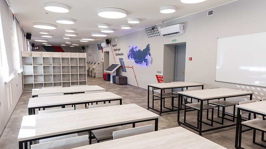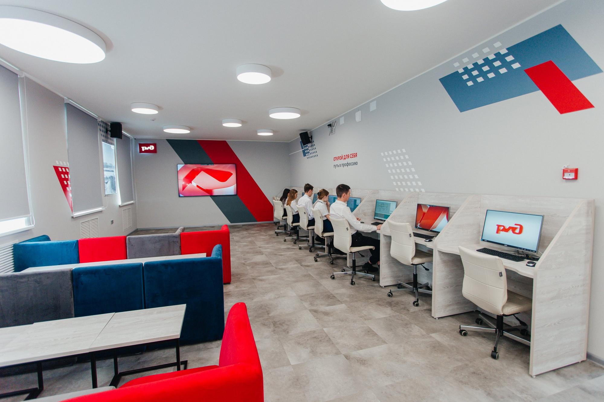 Современное образовательное пространство оборудовано современной мебелью, обеспечена мультимедийным оборудованием – экранами, интерактивными досками, тач-панелями и компьютерами для полноценного учебного процесса. Здесь будут проводиться тематические мероприятия и мастер-классы. Создана в рамках программы взаимодействия ОАО «РЖД» с университетскими комплексами железнодорожного транспорта.
