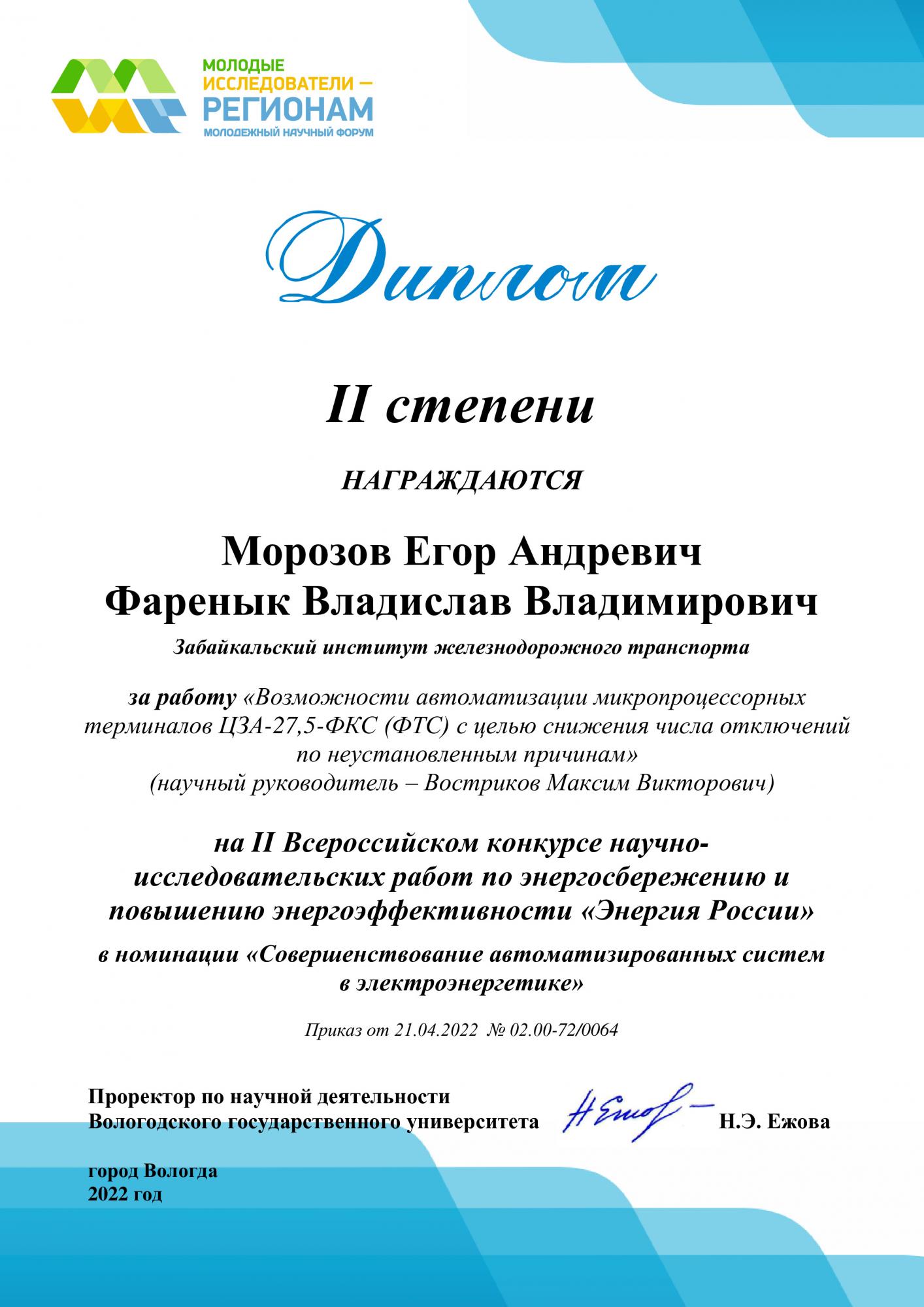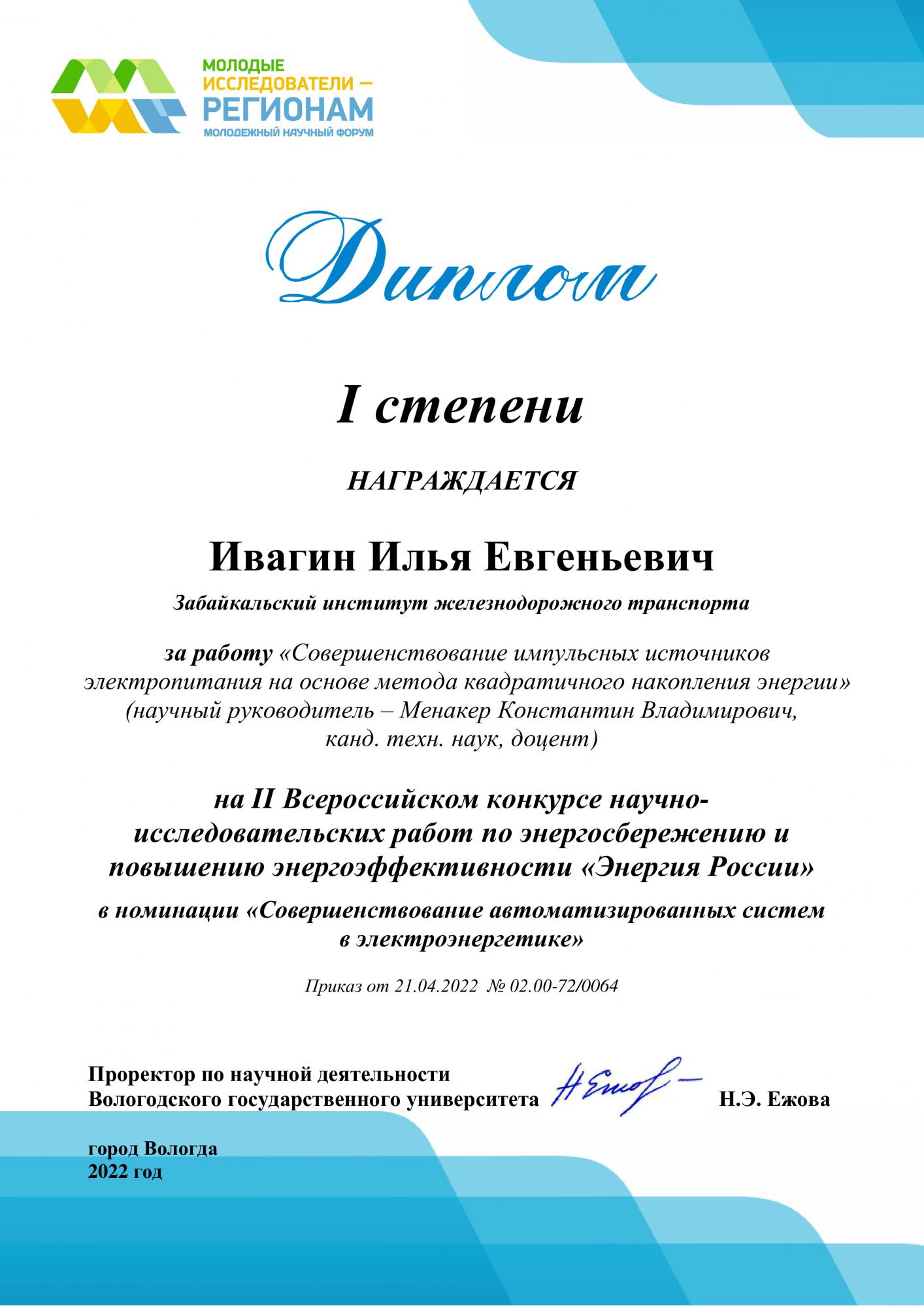 В апреле 2022 г. в Вологодском государственном университете в рамках молодежного научного форума «Молодые исследователи – регионам», проходил II Всероссийский конкурс научно-исследовательских работ по энергосбережению и повышению энергоэффективности «Энергия России».