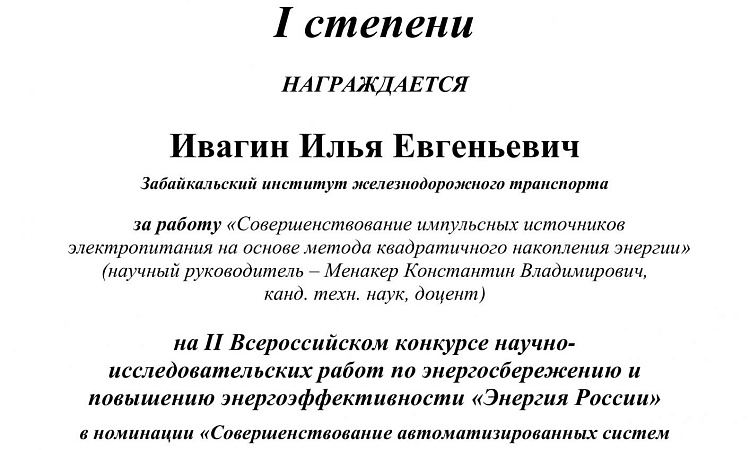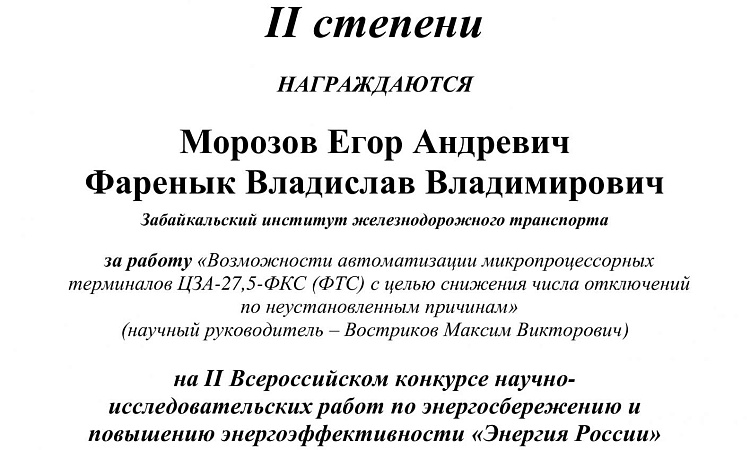 Студенты Забайкальского института железнодорожного транспорта (ЗабИЖТ ИРГУПС) приняли участие в номинации «Совершенствование автоматизированных систем в электроэнергетике» и заняли первые два почётных места:
